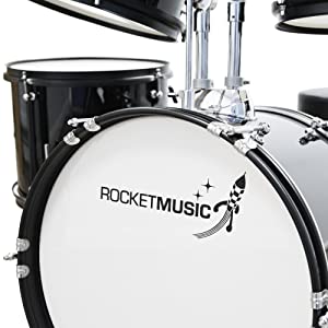 | Scaled down versionThis drum kit is a scaled down version of a standard full size drum kit, retaining the quality and functioning exactly the same way, just in a package thatâs more suitable for younger players. | Includes everything you needComes with everything needed to start right away, including all stands, kick drum pedal, sticks and a drum stool. Also comes in two attractive finishes, black or red. | Quality from Rocket MusicStandard 5-piece kit set-up including a kick drum, two rack toms, a floor tom and a snare. This kit also includes cymbals, being a hi-hat and a crash cymbal. |