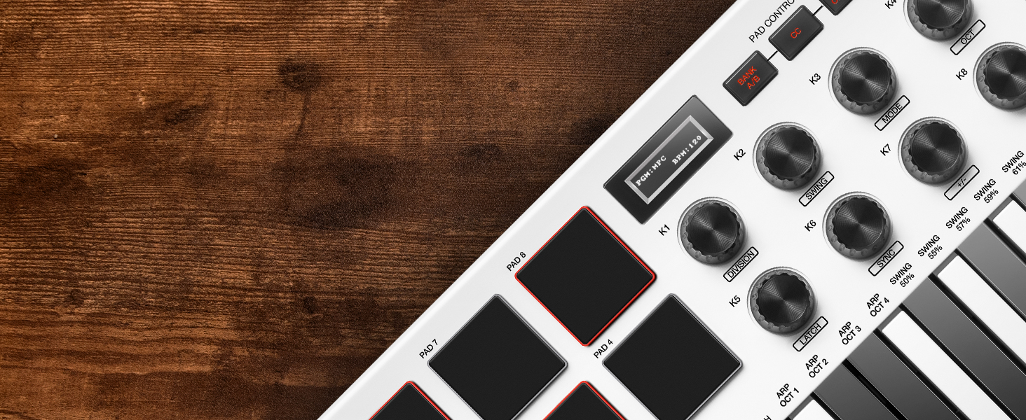 MPK miniâs OLED display places core visual feedback of DAW mode selection, velocity, CC, and more, right where you need it. Spend more time focusing on your music and less on your computer screen.