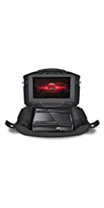 Rugged Case DesignThe rugged shell provides protection to your gaming console and accessories. | 19 inch HD 720p LED DisplayThe ultimate 19 inch entertainment platform to enjoy games, DVDs, or streaming media like Netflix, HULU and You Tube. | Touch Panel Control2 Stereo Speakers provide outstanding sound, 2 3.5 millimeter stereo headphone jacks, volume and brightness controls. | Components2 accessory storage bags HDMI cable Power supply 100-240v AC; Ships with EU and UK plugs Remote control Sling shoulder strap |