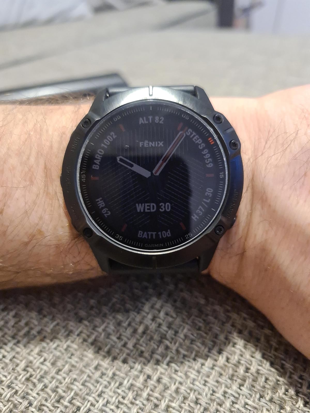 I’d read reviews saying the 6x was then to go for as it has a bigger screen and can have more fields. My eyesight at 48 isn’t great so I hold the watch at arms length to view while running. Even so the 6 is fine, I just have less fields shown at once so they’re bigger. The 6x just looked ridiculous on my male relatively skinny wrist. The 6x also has longer battery, but I get 3 weeks on the 6 – how much are can you need unless you’re an extreme athlete/adventurer!