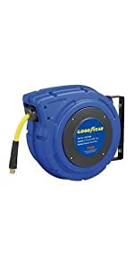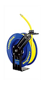 I just had a nice 2 post lift installed and mounted this reel high up on the post so the end of the hose is just at a comfortable reach, this is adjustable. I chose Goodyear because a have several Goodyear hoses that are at least 25 years old and they are still as good as new.