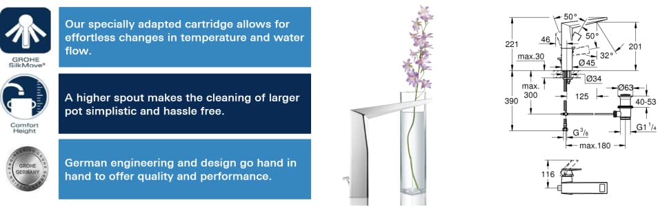 Die Einhand-Waschtischbatterie hat eine stattliche Gre und ist ein wahrer Hingucker im Badezimmer. Die Qualitt ist einwandfrei und sehr hochwertig. Das Montieren ging sehr einfach und ohne Probleme. Vor dem Kauf sollte man bercksichtigen, dass hier keine Zugstange vorhanden ist und somit der Ablauf nicht ber die Waschtischbatterie geschlossen werden kann. Der hohe Auslauf ist ein absoluter Vorteil. Ich mag es, wenn ich Platz habe ob beim Hndewaschen oder auch beim Saubermachen. Auch Haarewaschen ist hier problemlos mglich.