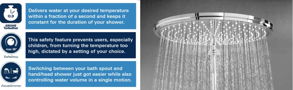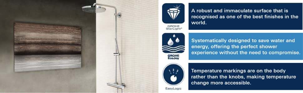 Gut durchdachtes Duschsystem von Grohe welches ich ohne Schwierigkeiten ganz einfach austauschen konnte. Luft bisher ohne Probleme und die Temperatur wird perfekt gehalten. Bin mehr als zufrieden und geben daher auch die volle Punktzahl und eine klare Empfehlung fr Grohe