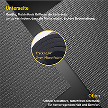 It’s 7 MM thick, textured non-slip coating on the top, circular grips all over the under side, thick and foamy on inside.