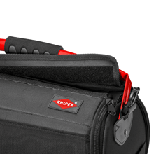 The shoulder strap on the bagThe shoulder strap on the Knipex 00 21 08 LE performs two functions. Here it is attached to the bag. | Shoulder strap as mobile phone pocketThe shoulder strap can also be used as a pocket for a mobile phone or as a tool belt. | Steel handle holds a total weight of 20 kgThis tool bag can store lots of tools. It can be securely carried using the steel handle with soft grip. | Tool straps and plenty of spaceThe plastic base tray: the generously dimensioned space for tools with tool straps. |