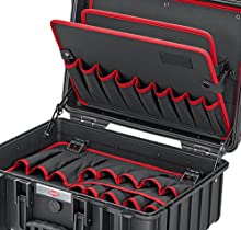 Tools are safely accommodated in the Knipex 00 21 35 LE during transport. On arrival at the point of use, with just a few hand movements the technician is able to set up his own work area. A tool board can be removed. Tools have enough space in the 35 pouches that can be filled securely as necessary. The “Robust†tool case can take 25 kg of tools along with it without a problem.