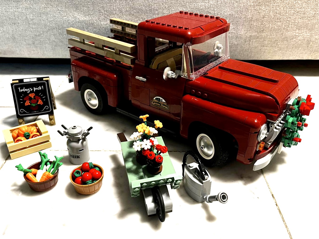Loved the build of the truck and the truck itself, however, Lego?? the accessories were weird (wreath) and way out of scale (watering can) and unnecessary (Wheel-Barrow) you would be much better of having a driver?? – I left all this stuff in the box where it will stay!
