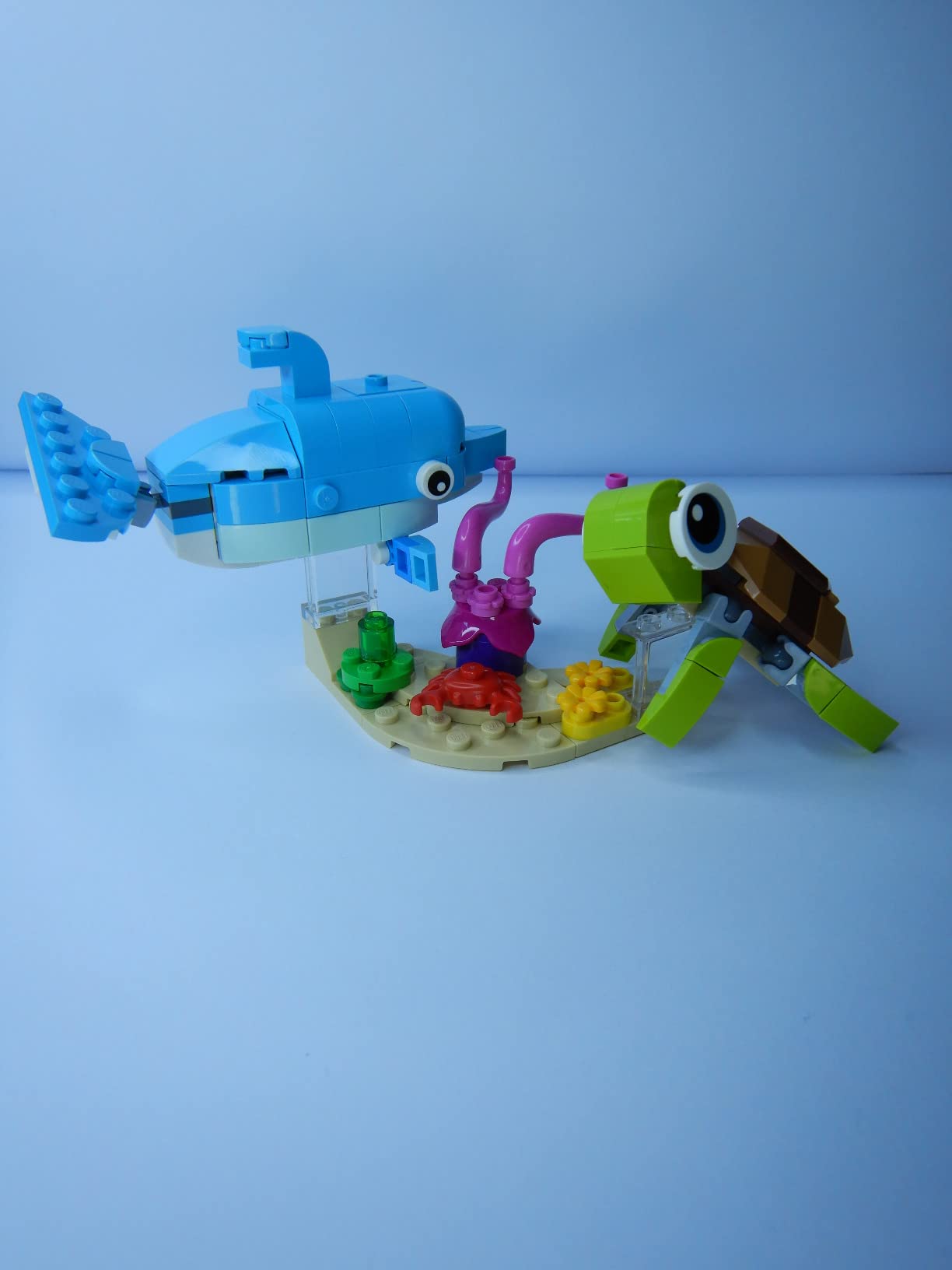 Mit dem Set macht man nichts falsch (auer man kauft es zur UVP). Aus den Steinen lassen sich schnell ganz verschiedene Modelle bauen, an denen Kinder auch lnger Spa haben. Mit Schildkrte, Seepferchen, Fisch und Delphin finden Jungs und Mdchen etwas, was ihnen gefllt. Zum Glck liegen die Bauanleitungen fr alle drei Modelle gedruckt bei, man musst nicht erst ein PDF laden. Die Creator 3-in-1 Serie gehrt berhaupt zu den besten Reihen, die Lego anbietet (neben Ideas). Hier wird die Lego-Idee noch hochgehalten, man kann immer wieder etwas Neues bauen. Auerdem sind die Teile sinnvoll mit anderen Lego Teilen kombinierbar und machen auch spter in der groen Sammelkiste Sinn. Die Bauzeit je Set betrgt 10-15 Minuten. Die beigelegten transparenten 1×2 Blcke erlauben es auch, die fertigen Modelle fr ein paar Tage im Regal auszustellen. Mein Lieblingsteil im Set: Die pinken Elefantenrssel, die als Schneckenaugen genutzt werden. Meine Wertung 9/10.