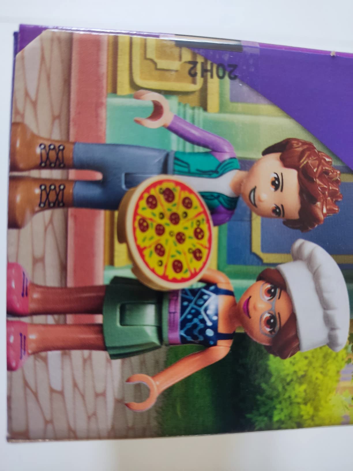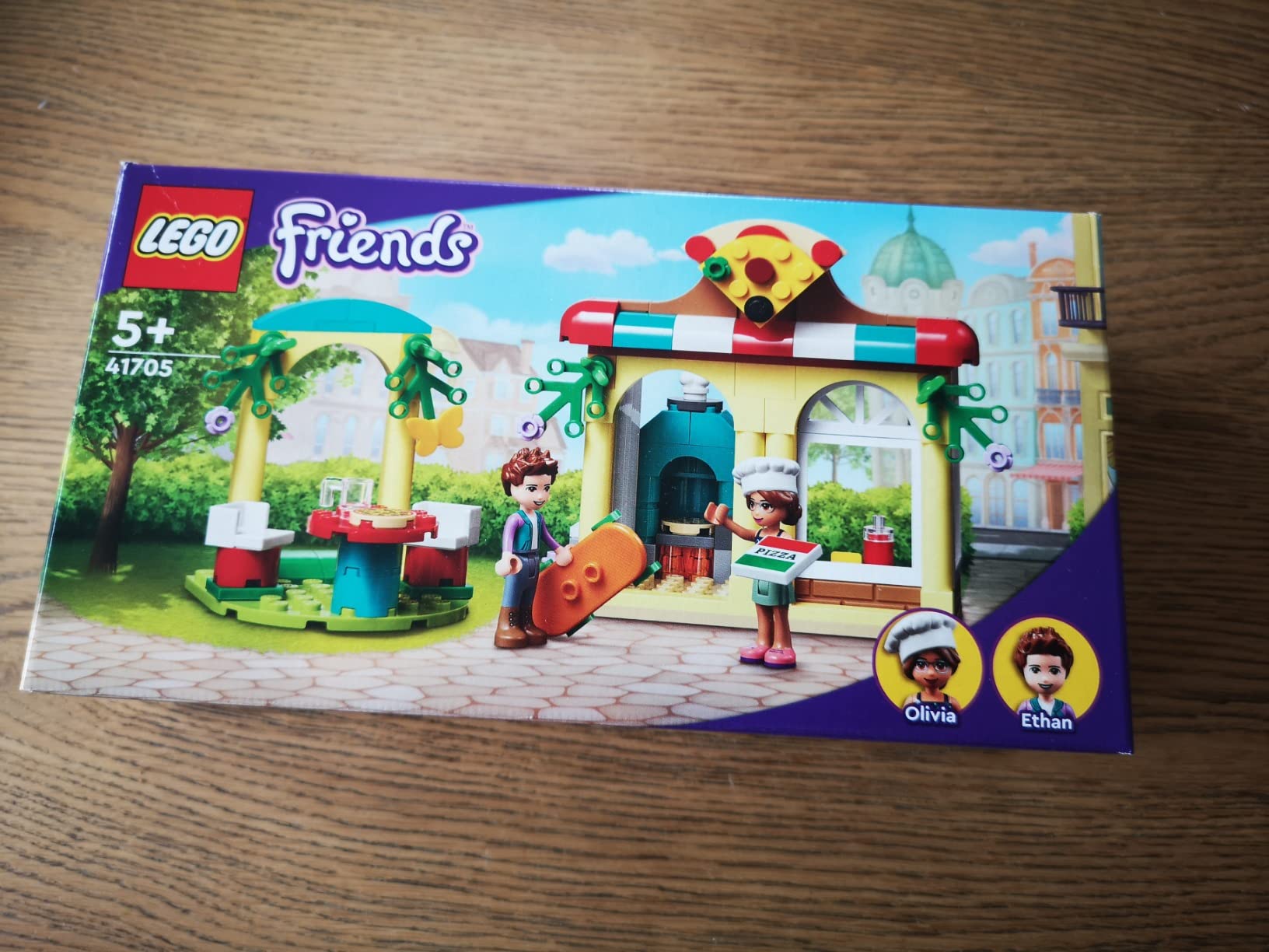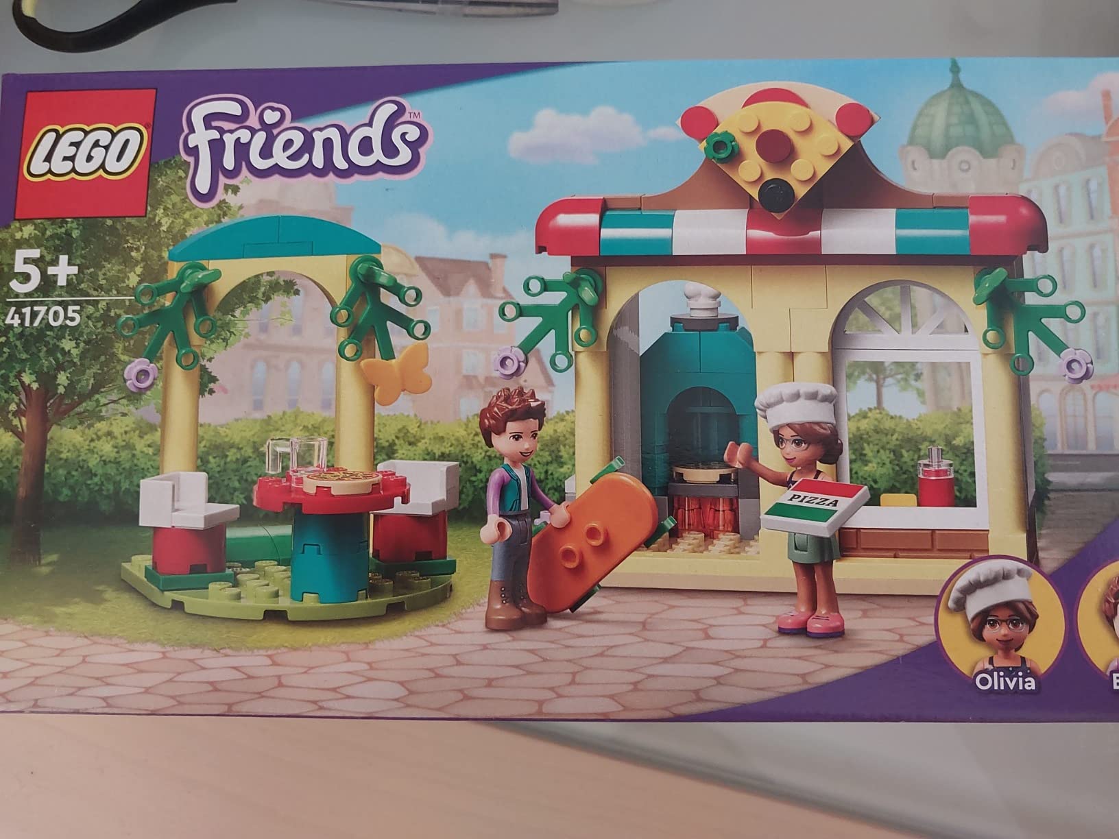 Petite boite de Lego Friends avec une terrasse de pizzeria et son four, ainsi que le livreur en skateboard.