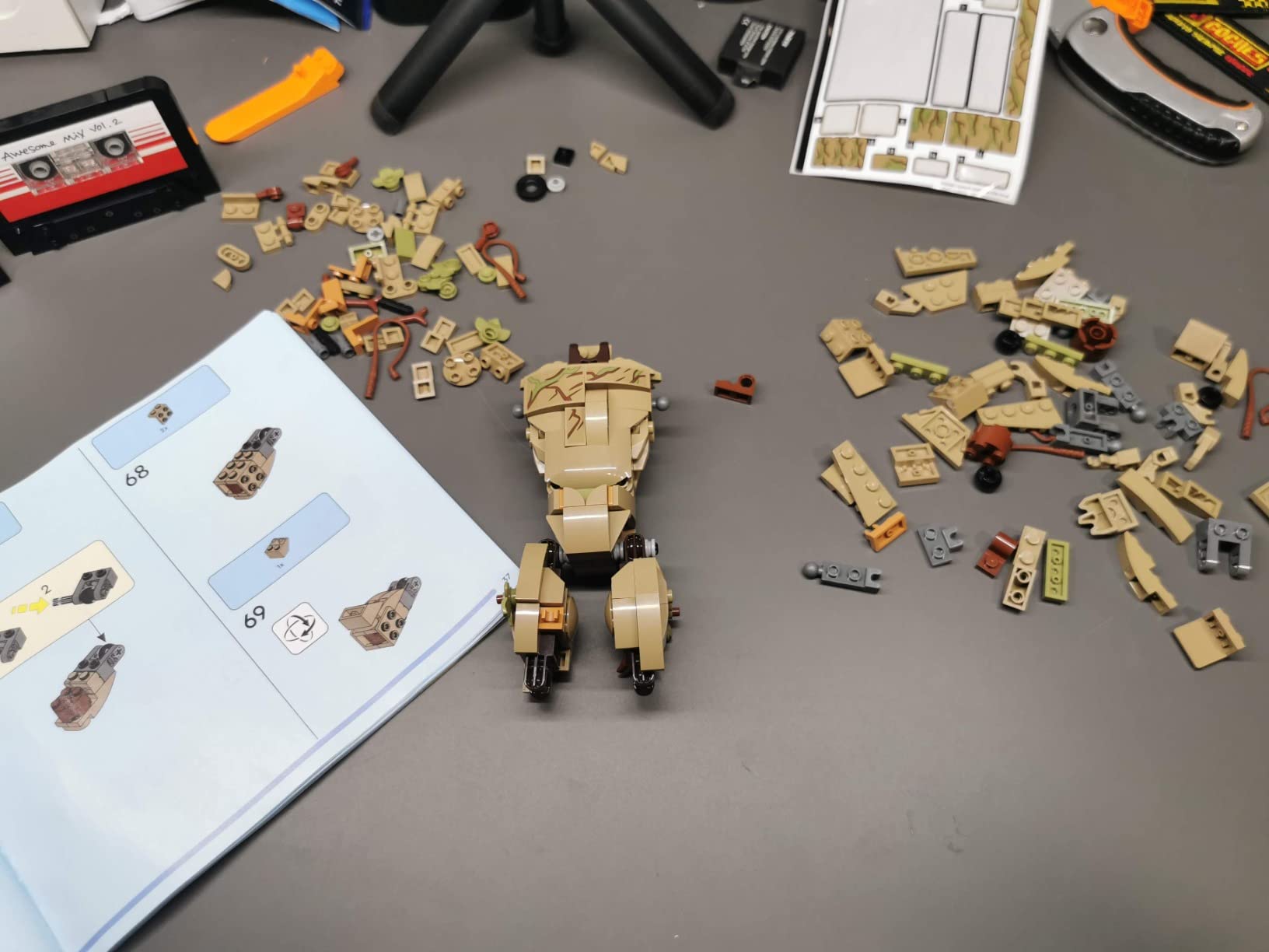 1st you start by putting the back and sticker onto the plaque, and then you build the tape. You then move on to building Groot. Starting with the main body, that’s Bag 1 complete.