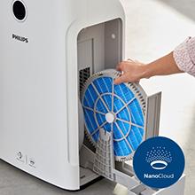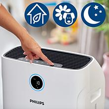 | Hygienic Humidification up to 600 ml/hNanoCloud technology uses a natural and hygienic evaporation process to ensure superior performance up to 600 ml/h. Once the water is evaporated, the water mist becomes invisible and the smaller molecules are less able to carry bacteria into the air. Our laboratory testing confirms that NanoCloud technology spreads 99% less bacteria than leading ultrasonic humidifiers. It also prevents wet spots and white dust. | AeraSense TechnologyBenchmarked against a professional-grade sensor, Philips AeraSense technology is highly effective in sensing even the slightest change in indoor air conditions. It continuously monitors the air and automatically adjusts the fan speed when it detects a change in particles. | Reduces Bacteria and VirusesOptimised purification function effectively detects and reduces bacteria and viruses, such as H1N1 (influenza), for cleaner air and a healthier home. | 2 Usage ScenariosSwitch between 2-in-1 and Purifier Only modes at the touch of a button. Choose 2-in-1 for cleaner air without dry air discomfort during dry seasons. Purifier Only mode turns off the humidification function when it isn’t required. |