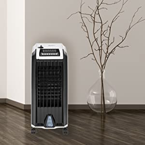 4-in-1 SystemThe 4-in-1 system functions as a cooler, heater, air purifier and humidifier at the touch of a button. Ideal for your home or office, this oscillating air cooler and heater provides easy to use digital controls and a 24 hour timer for convenience. | 3 Airflow SettingsWith 3 air flow settings normal, nature and sleep, you can take full control of your environment. Two power heating options and three fan selections are also on hand to ensure your home is kept at the perfect temperature, whilst a water pump circulation system purifies and sterilises the air. | Remote Control for ConvenienceControl the temperature from the comfort of your chair with the remote control with soft touch control panel system for ease and convenience. The air cooler and heater also includes versatile castors for easy portability around your home or office. |