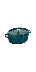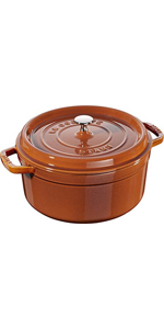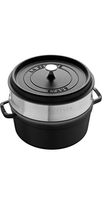 Staub brands utensils are made in France and extremely high quality cast iron pan. Food tastes very unique as the heat spreads even and very tasty.