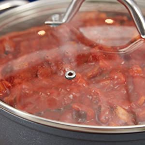 Though aluminium they work really well on our Neff induction hob because of the bonded steel base. The walls are thick, substantial and radiate heat very effectively from the base into the walls of the pan. Cleaning seems to be effortless: scorched milk deposits lift off very easily, and though I haven’t had the pans long enough to encounter a serious burn, I suspect it would be very easy to cleans. The lids fit perfectly and I personally like that I can see the progress of the cooking without having to lift the lid and let too much moisture escape, though each lid has a small vent hole.