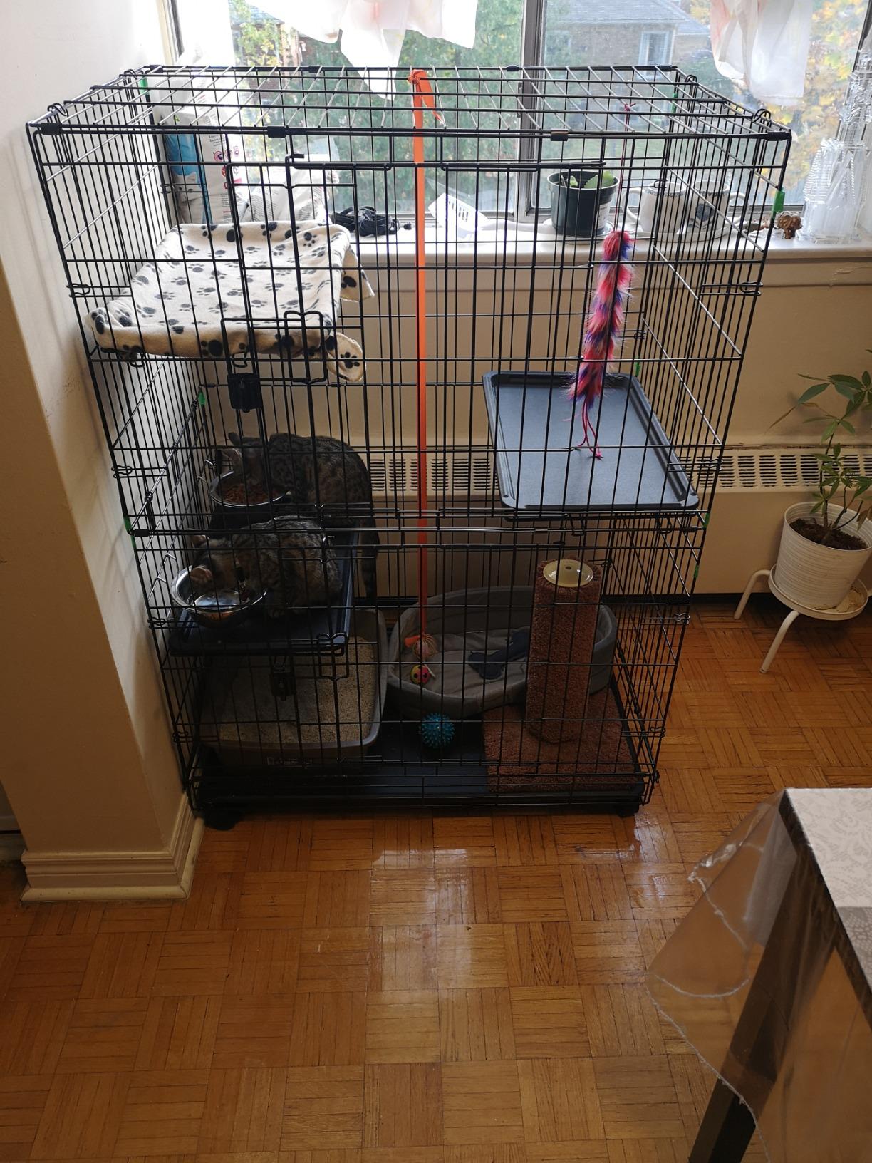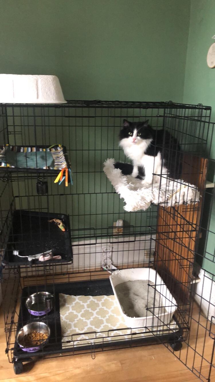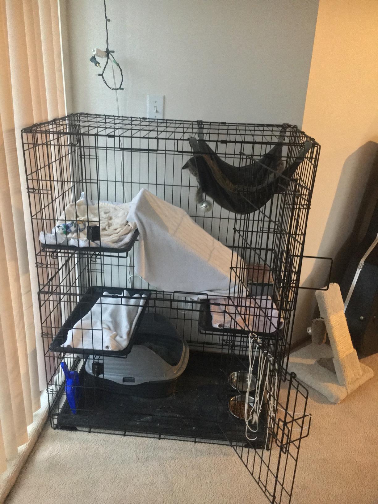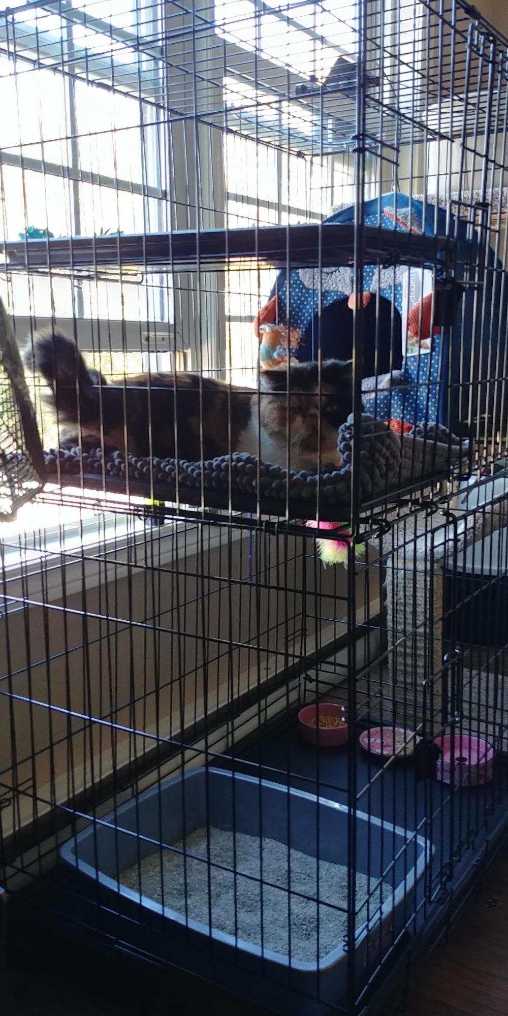 Suggestion – put some carpet on the bottom of cage for kitty to have a good footing for jumping (no sliding).