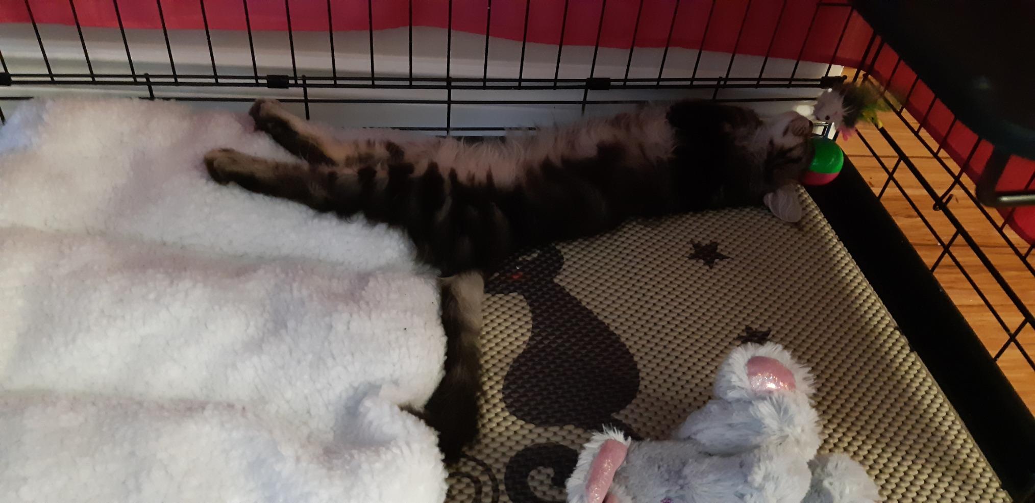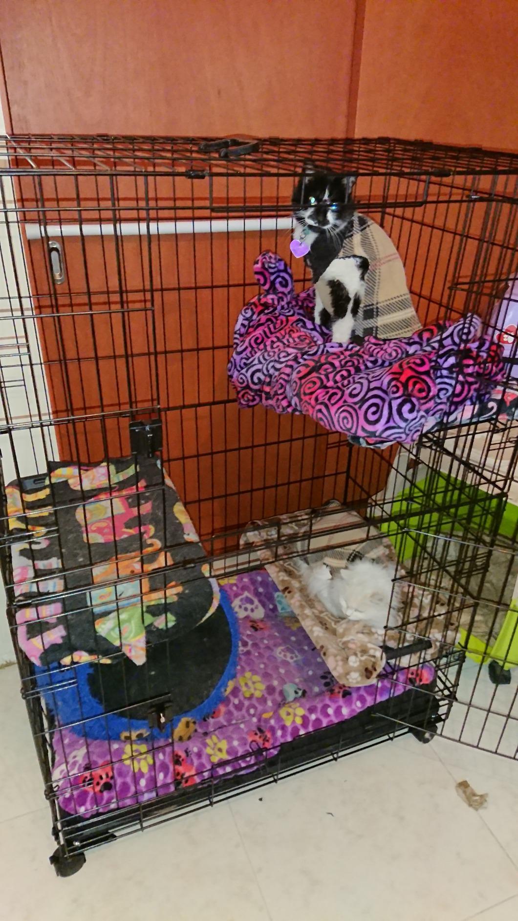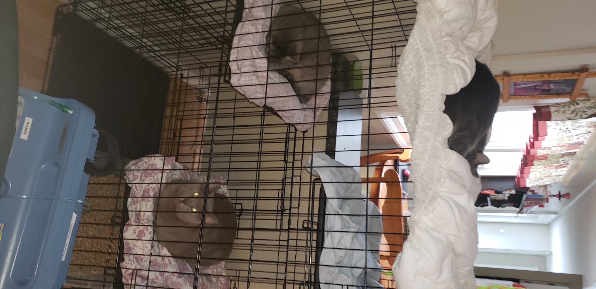 Suggestion – put some carpet on the bottom of cage for kitty to have a good footing for jumping (no sliding).