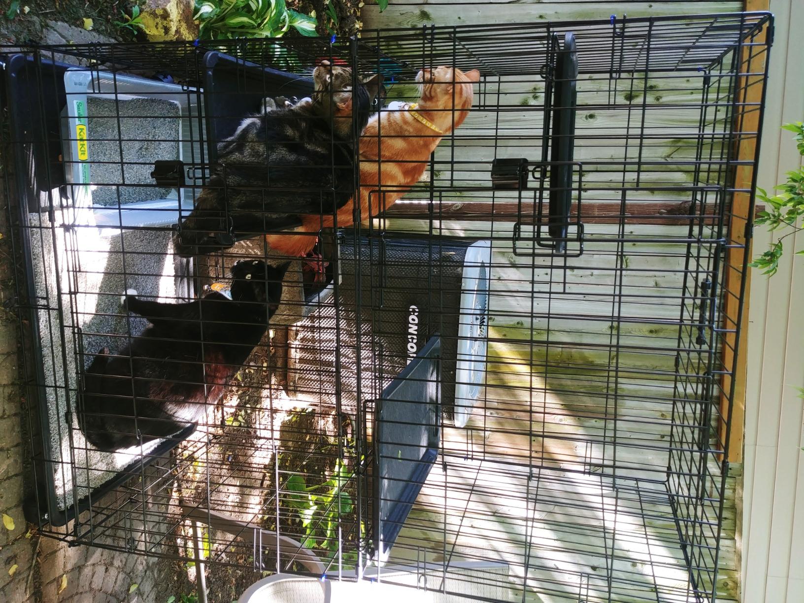 Product arrived with some damage to the metal which caused it to be a bit difficult to unfold for assembly. I will straighten the wires out eventually with some pliers, so not a big deal. This cat kennel has proved invaluable for a difficult cat introduction to the household. It’s the perfect width to centre around the outside of a door, with the top blocked off with cardboard box to allow the cats to interact without murdering each other. The cat being introduced, has free run of a room, with the option of hanging out in the kennel to observe the resident cats when she feels comfortable.