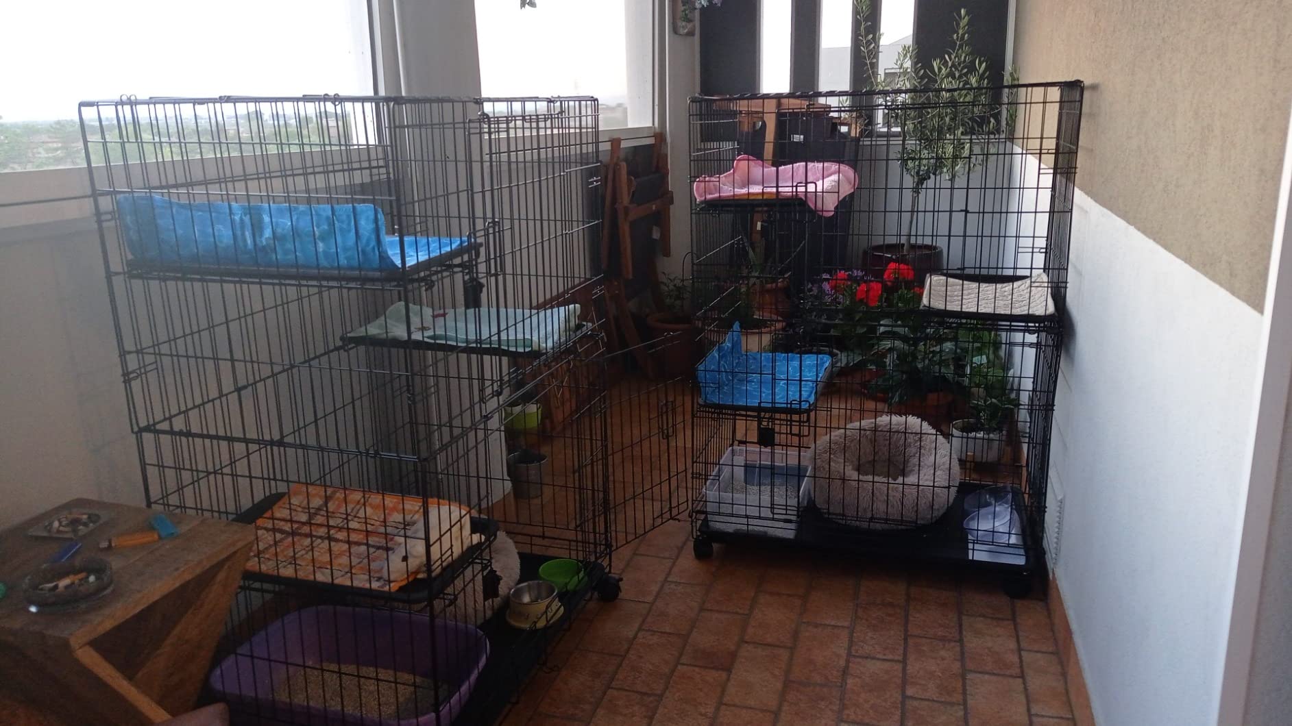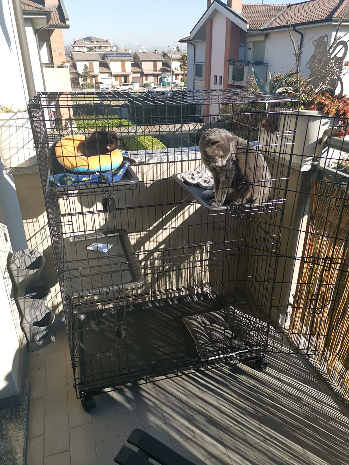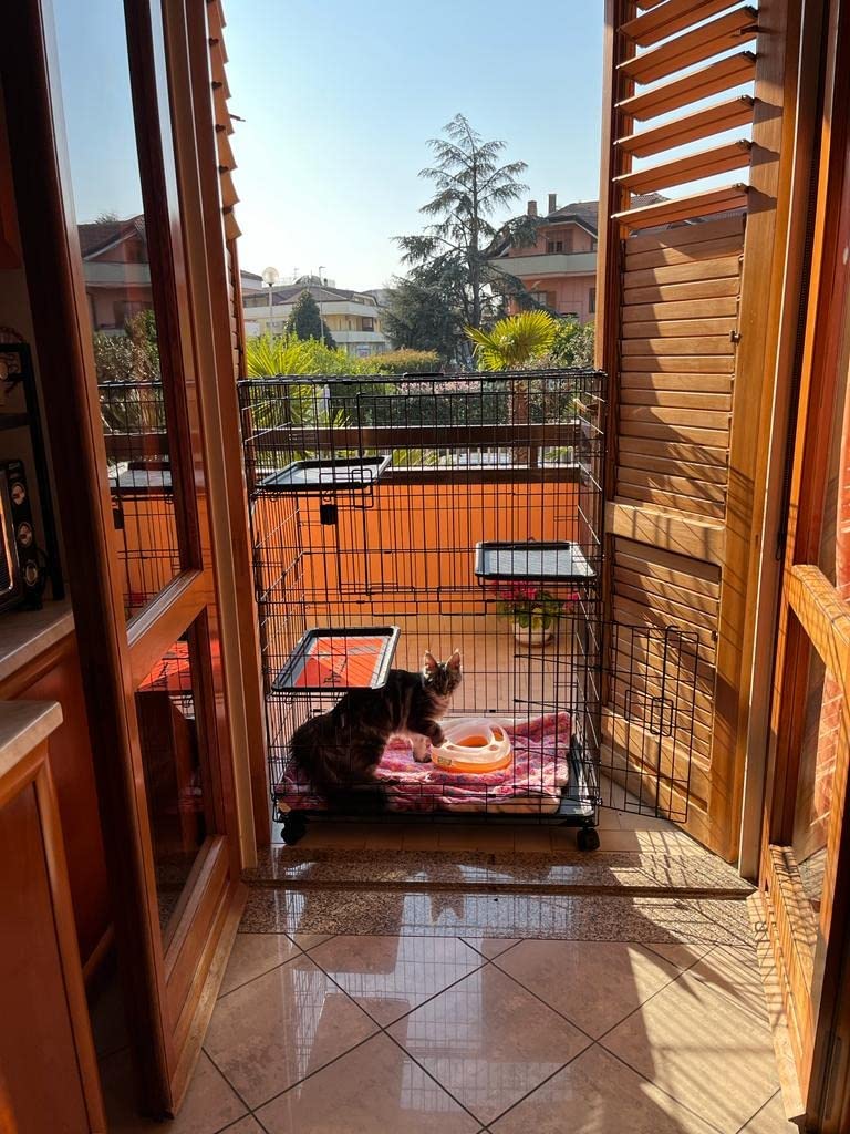 Ho optato per questa gabbia poich nel condominio dove vivo un problema installare una rete di sicurezza sul balcone. Devo dire che come soluzione alternativa perfetta. I gatti ci stanno dentro volentieri a prendere il sole e possono guardare oltre la ringhiera senza problemi. La gabbia molto robusta. Come dimensione giusta per due gatti. Il montaggio semplice e intuitivo. Ci ho messo una mezz’ora a montarla. Per chi ha bisogno di una soluzione poco costosa o per chi, come me, non pu installare una rete di sicurezza va benissimo.