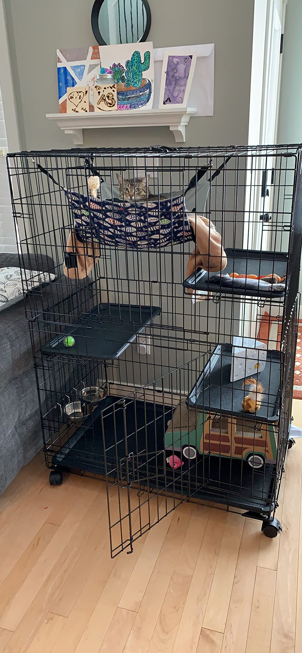 With this “playpen cage” we were able to take the cats to “grandma’s house” and they were able to see everything (including us) and we didn’t need to worry about them getting into things or escaping out the front door. We were also able to put their food and water bowls as well as a litter box on the floor of the cage with plenty of room for them to jump up to the three shelf levels. The casters made it easy to move them to the bedroom with us for the night.