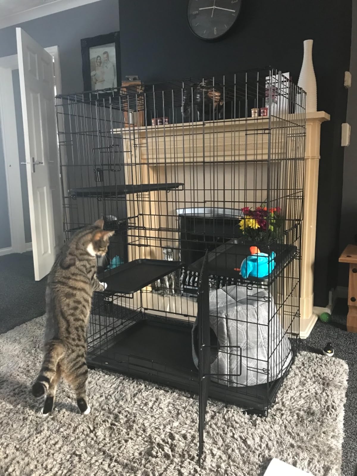 My cat absolutely loves this cage, it is such a big space for such a good price. It’s a perfect space for just one cat, maybe not if you had any more cats there wouldn’t be as much room for them. Quite difficult to assemble though, it took 2 adults to assemble it, it doesn’t just pull up, you have to lift it and clip everything in place, then assemble the shelves in for sturdiness. I also bought some self adhesive wall hooks to keep it against the wall just in case because it could potentially tip over due to how tall it is. Apart from that it’s amazing, I would 10000% recommend!! Thank you Amazon!