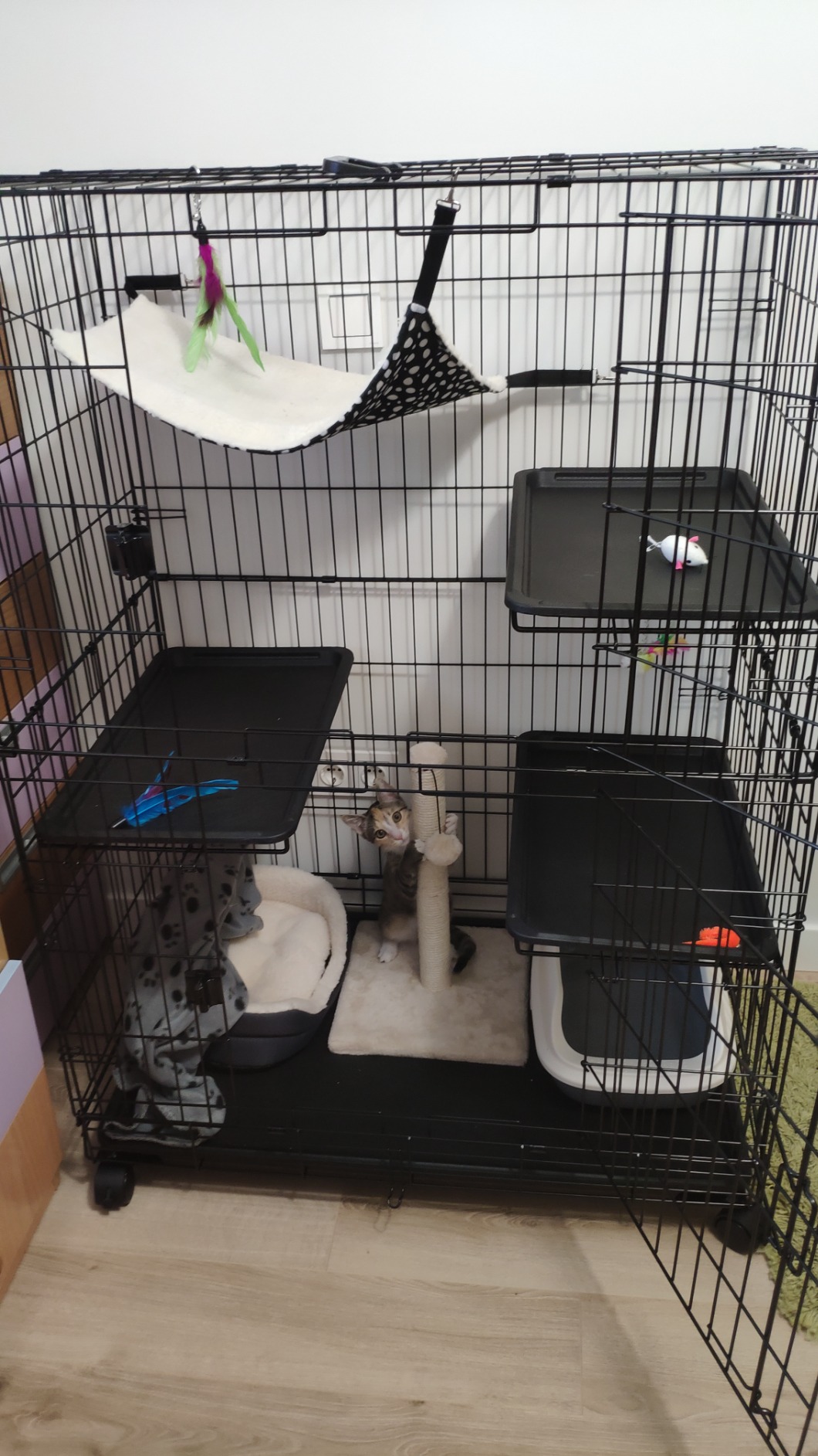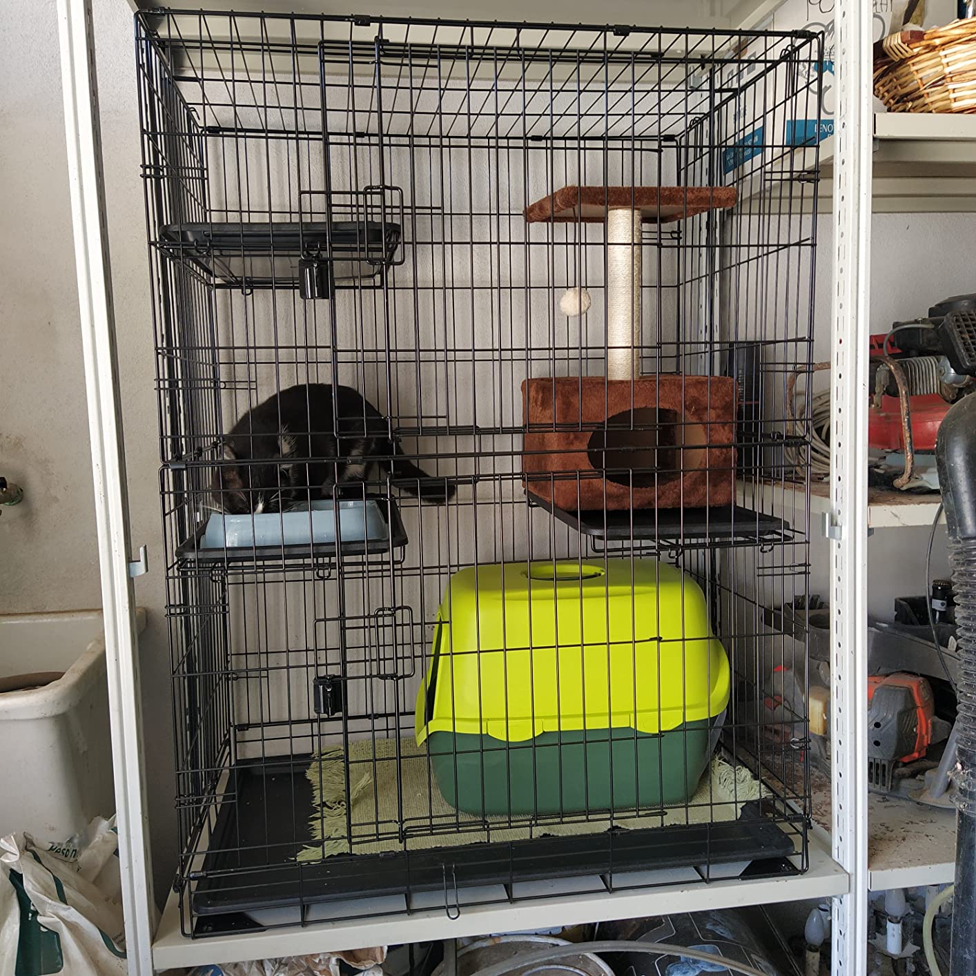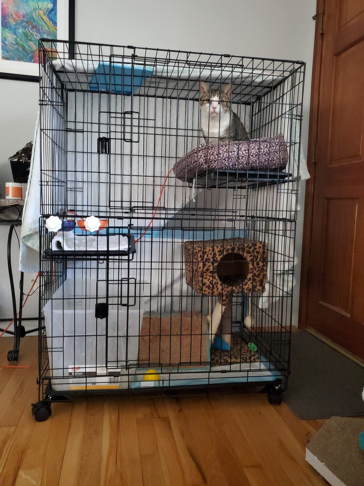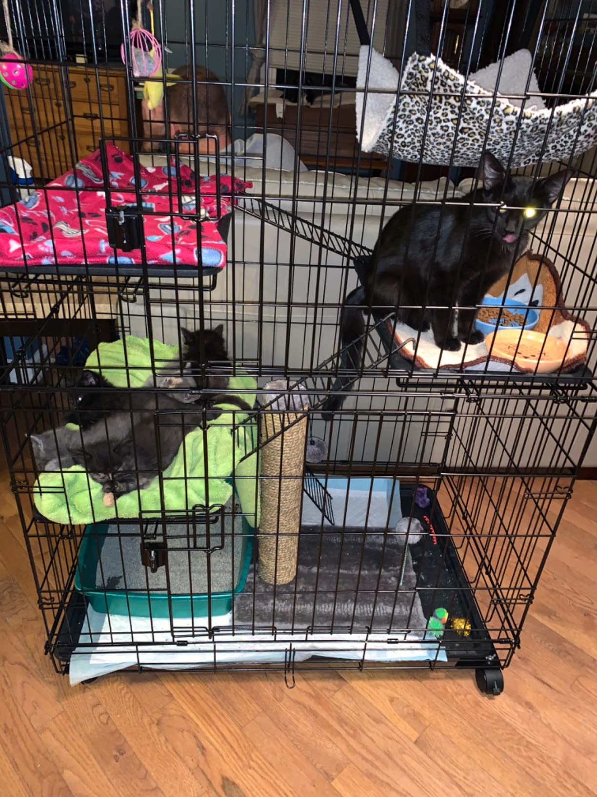 At first I got this crate for my older cat. I wanted to give her an area to call her own – like a safe place, still high enough for her to observe. She liked it. It has been most helpful for my little kitten though. I put him inside at night time because otherwise he won’t sleep at night. Also whenever I leave him alone I put him in there so he doesn’t hurt himself or get into anything. It’s anlifesAver. Very large, perfect amount of tiers. Litter box on the bottom, then food and water, then a play area and then a sleeping area. It’s the least cruel thing lol