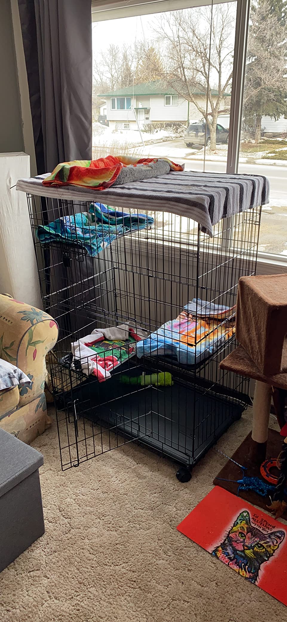 We were getting new windows in our rental unit and didn’t want to confine our two cats to our tiny bathroom where they would hear a lot of noise from the workers and we would not be there to offer comfort. After searching for a large dog kennel and finding nothing that wasn’t extremely expensive, we found this item.