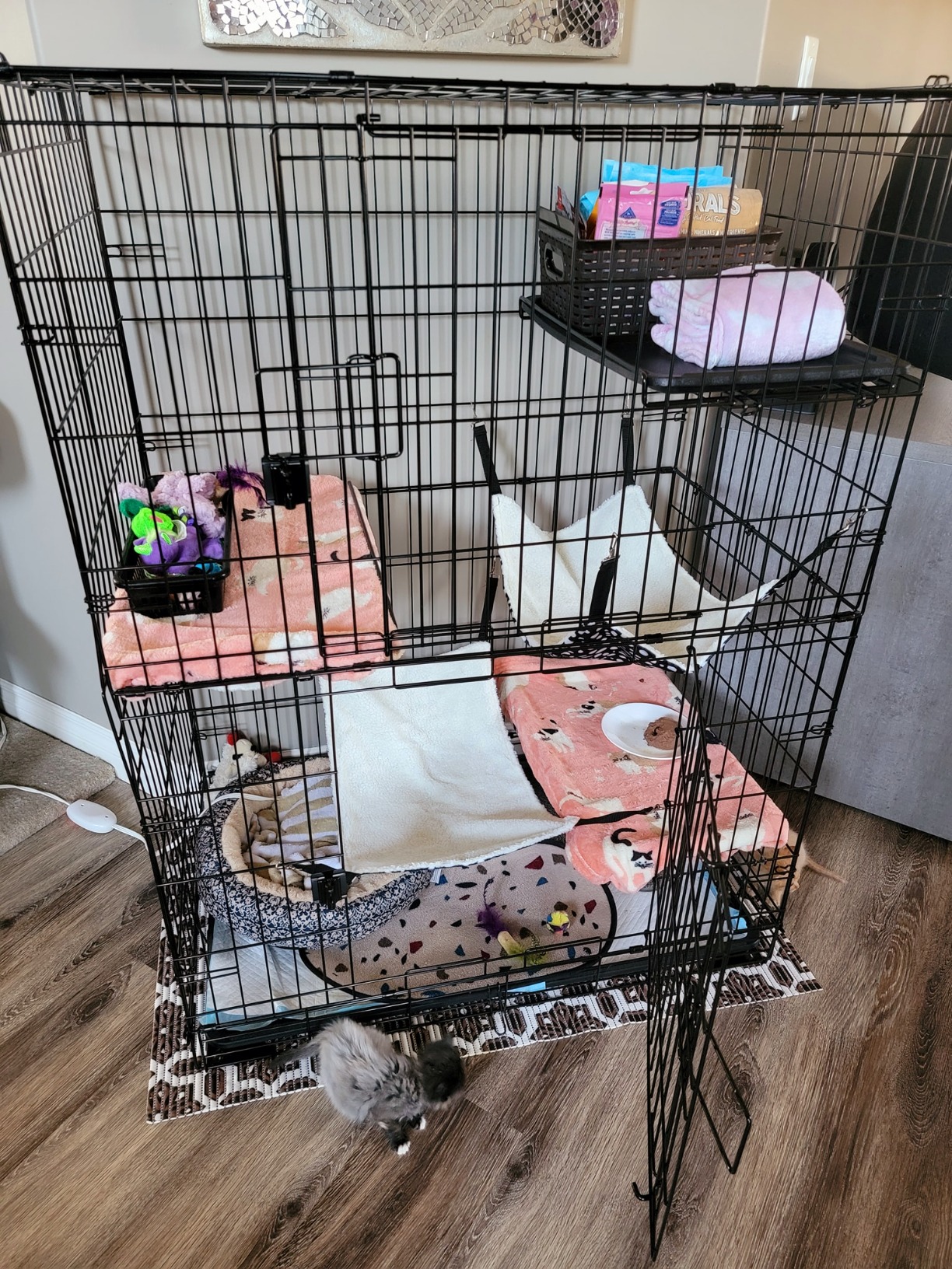 I got one of these to keep my kitten out of trouble when I’m not around. I noticed it was a bit flimsy and worried for her safety, so I made some modifications. I used black zip ties to secure the joints and edges for stability. I used more zip ties to secure the shelf wires to the cage. I drilled small holes in each shelf and zip tied those to the wire part so when my cat jumps it doesn’t flip over on her. Please consider doing this if you buy one for your cat.