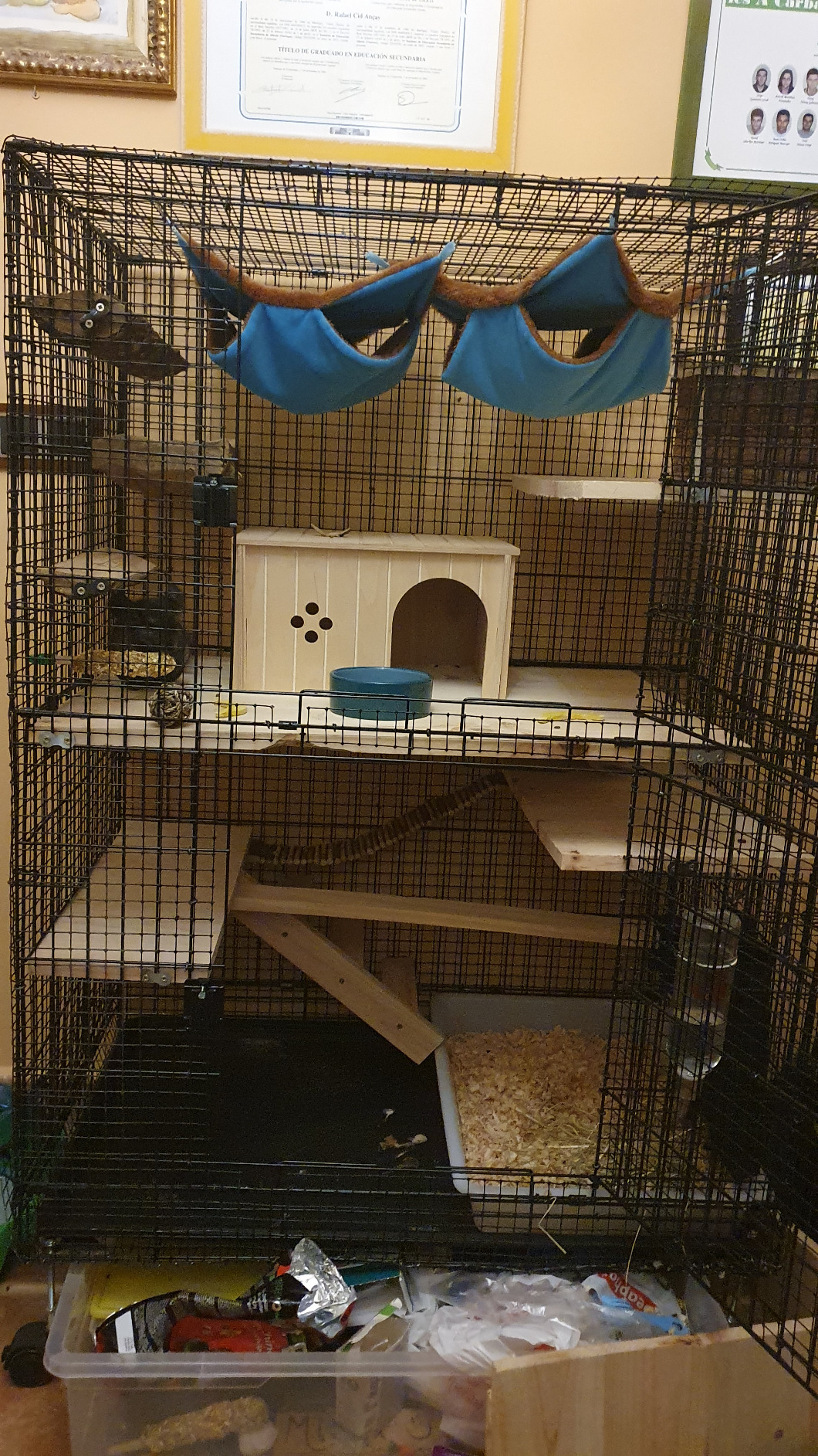 La jaula est buena, luce bien, de muy buen tamao. El problema es que los barrotes estn demasiado separados para el tamao de una chinchilla (an adulta) y tuve que forrarla por completo de malla de acero. An as, por el precio me pareci buen producto. Quiz para un conejo trepador. En los niveles pude elaborar escalones de madera y un puente colfante.