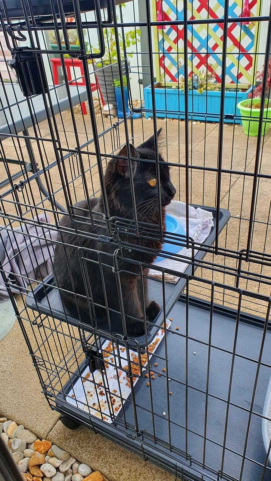 Good value cat cage. I have a large ragdoll and this is ideal to keep her safe on the patio. Easy to manoeuvre and she seems happy to spend time in it. I’m also very happy with it.