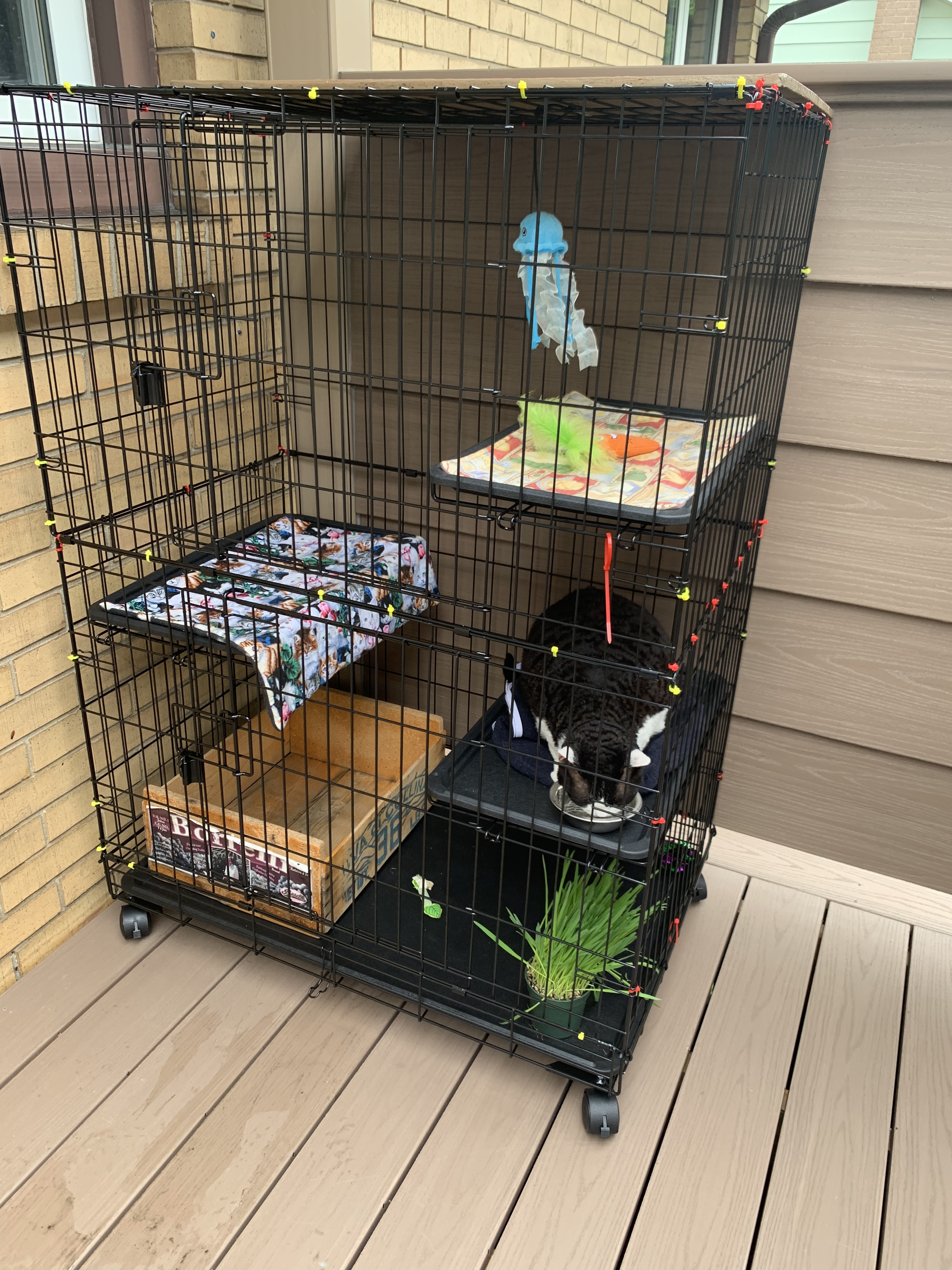 Bought this to help separate and introduce new kitties. It’s a nice size and is perfect for what we needed. Plan on using it to bring the kitties outside this summer. I zip tied cardboard to the top and put a bed up there. They love the top more than anything.