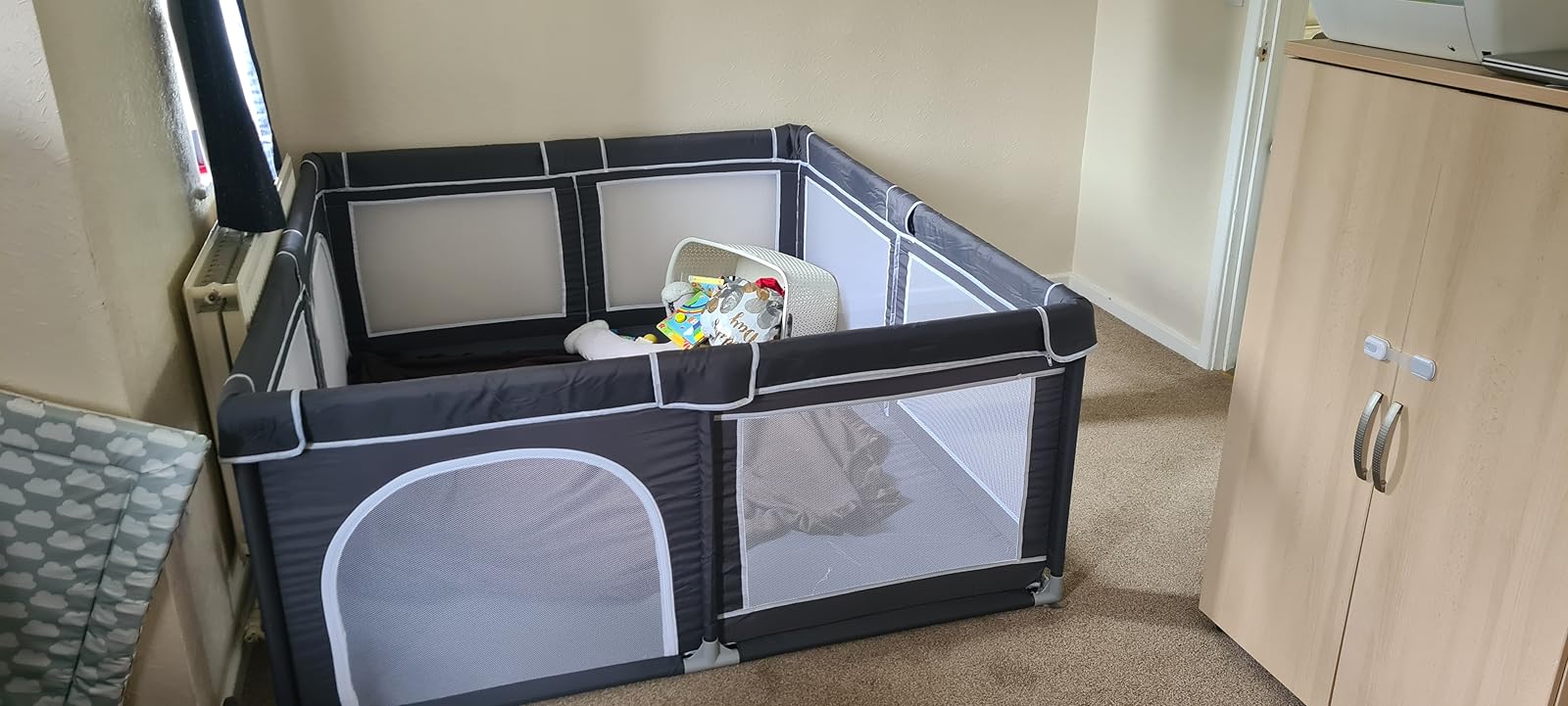 My son is starting to crawl so we wanted a playpen for him to maneuver freely around in while still being enclosed in a safe space. We have a traditional pack and play, but it’s a little too small now so we were looking for something that was larger and had more room for him to play in. This playpen is huge and very well made. Took about 20-25 minutes to put together but directions were easy to read. The sides are sturdy and stay up well even when leaning on it with some weight. Love that it’s mainly mesh all around so that he can peek through to see us and we can also see him clearly from the kitchen to the living room. We did put his foam play mat inside for more cushion but overall, very happy with this purchase.