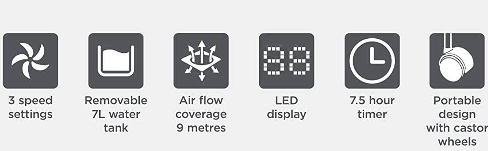 Good chilled air flow but a bit noisy. Needs included ice chiller pods to work well. Large unit but manoeuvrable. Good size tank. The control panel annoyingly flashes whenever the unit is on and the more you increase the fan the more the panel flashes.