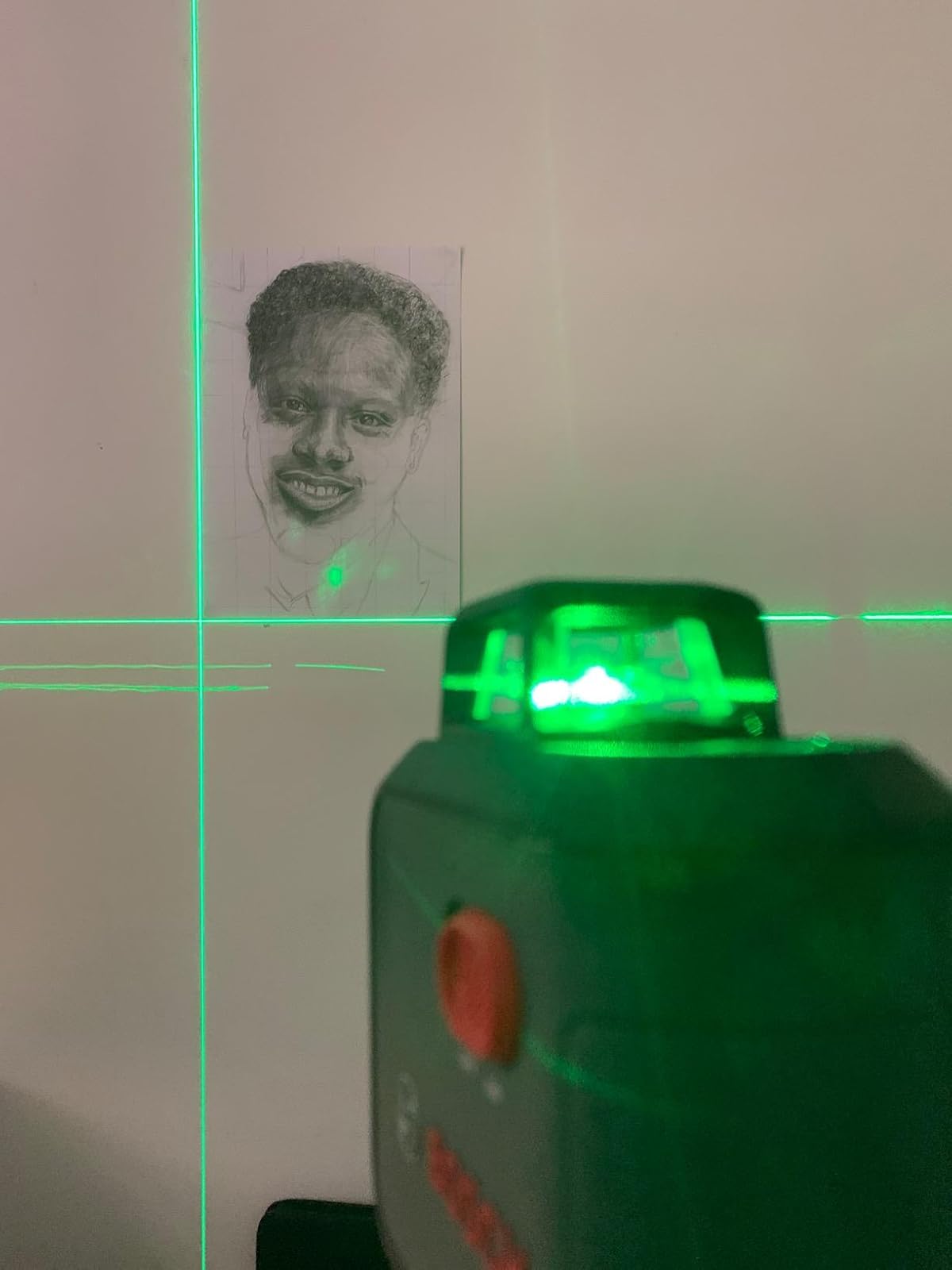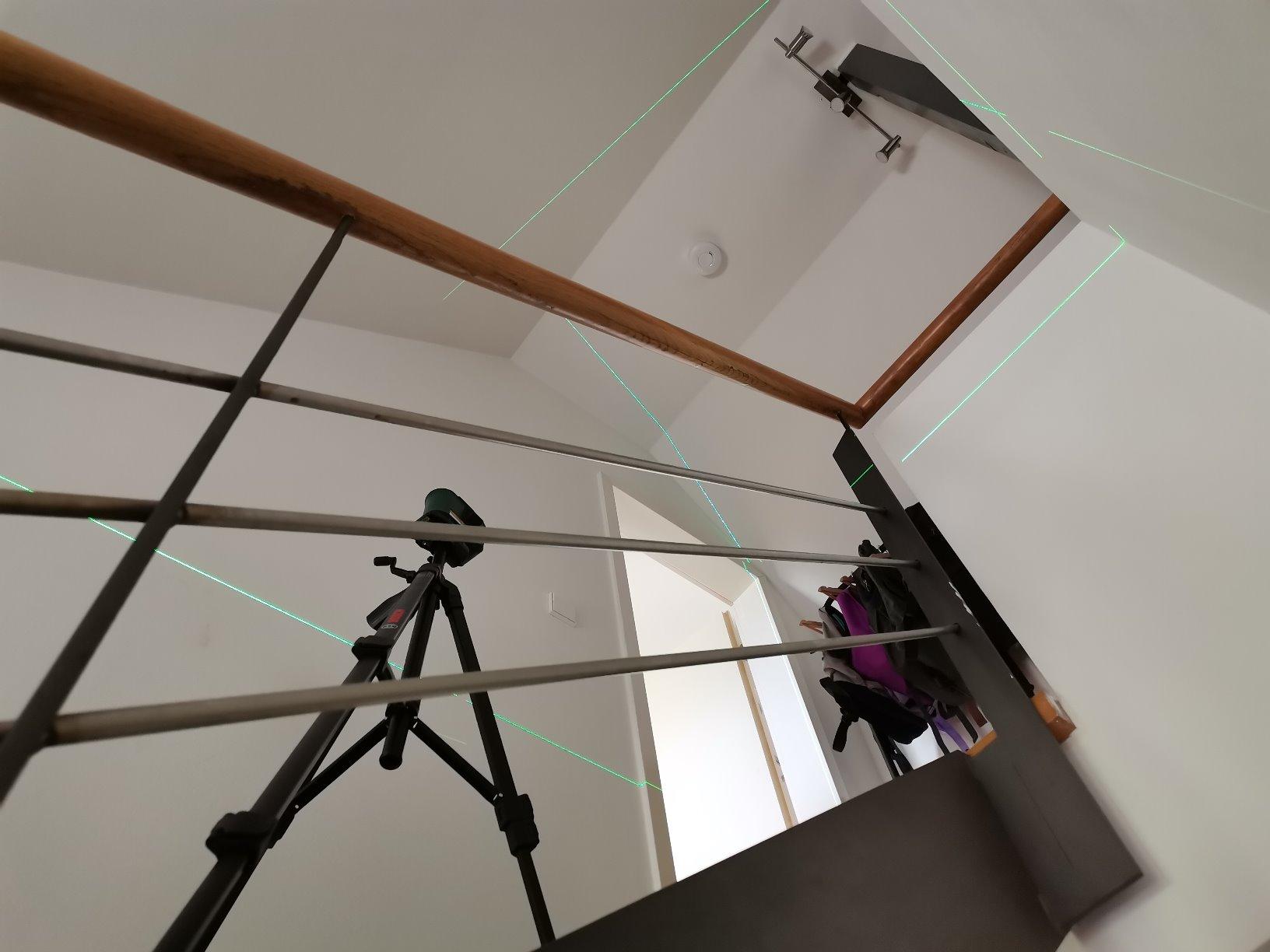 Wir wollten auf der Wand gegenber unserer Treppe zwei Bilder gerade aufhngen. Hierfr mussten wir ihn allerdings auf der Treppe richtig ausjustieren.