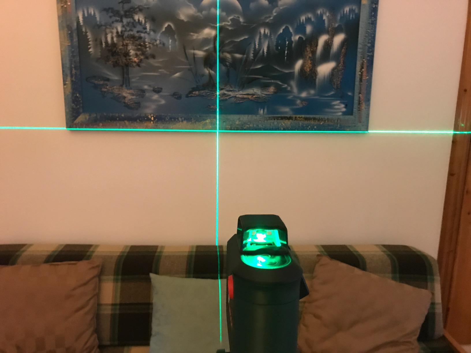 Die grnen Linien des Lasers sind deutlich und hell zu erkennen. Es gibt viele Optionen diese einzusetzen. In der Mitte unseres Wohn-/Kochbereichs positioniert erkenne ich im gesamten Raum klar und deutlich die Laserlinien. Der Raum hat insgesamt 42m2.