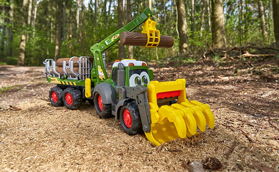 Dickie Toys 204119001 Happy Fendt Forest Toy Excavator with Trailer Mechanical Claw Over Handle Tree Trunks, Light & Sound, Batteries Included 65 cm Long, Gree