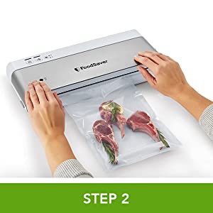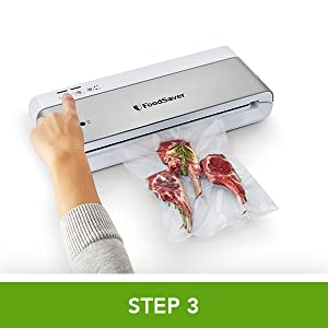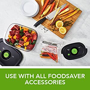 | Seals with 35% less bag waste compared to previous FoodSaver models*, so you’re able to save more food. | Saves valuable kitchen space by storing vertically or horizontally. | Use with FoodSaver bags, rolls, and more—including containers and zipper bags for marinating, and bags for sealing fridge and pantry items. |