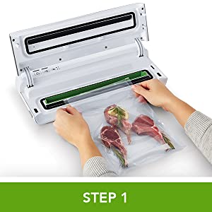 | Fill bag and place open end into vacuum sealing channel. Built-in bag alignment tool ensures correct placement every time. | Press down to easily close and lock lid. | Choose Moist or Dry custom setting, then press Vacuum button. |