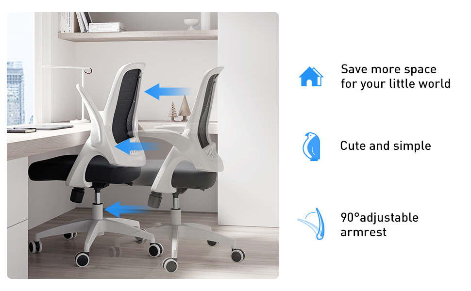 The arm rest folds up which helps it fit under any table easily having a small room this is very useful as it uses less space in the room. The mesh backrest is very stretchy which helps with back comfort and is breathable which helps reduce sweat when sitting for long periods. The lean feature helps relaxing on the chair during brakes.