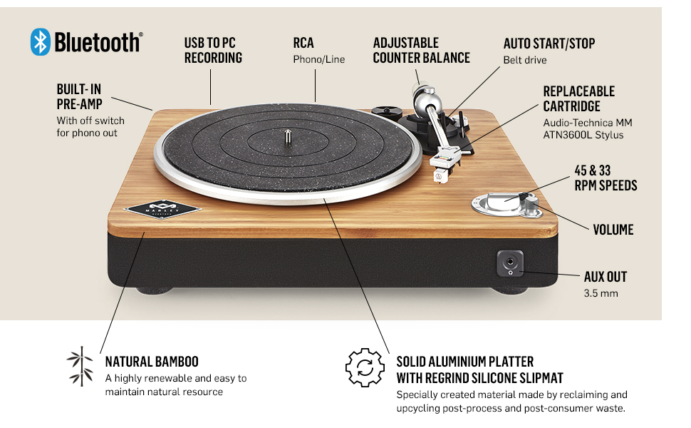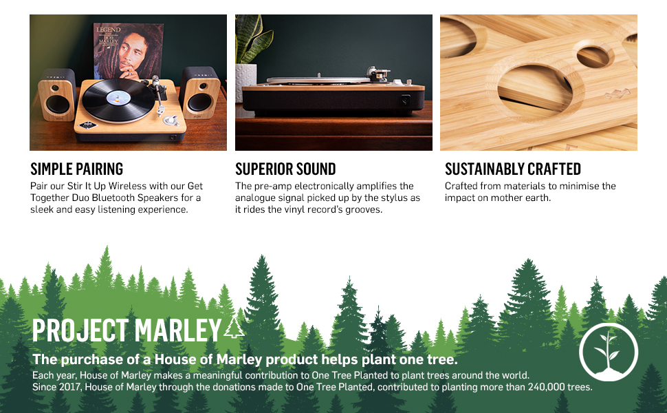 House Of Marley is known for its Eco responsibility, all of their products are sustainably crafted with various recycled materials and this turntable is no exception. This product uses responsibly harvested bamboo, recycled fabric, aluminium, silicone, plastic and paper for its construction components and packaging. The purchase of this product will also help to plant one tree in an effort to help global reforestation. Some people might not care about all of this, but regardless it is setting an example for other companies to follow suit and start caring about the sustainability of their products and the condition of the planet.