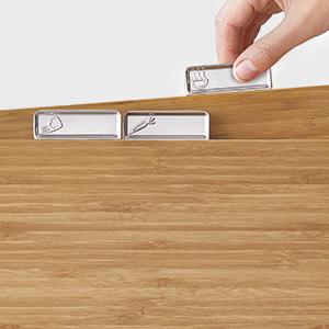 Tough bamboo surfaceBamboo resists marking and is tougher than wood. | Metal base with non-slip feetMetal base holds each board securely in place. | Index-style tabsTabs indicate the specific function of each board and make for easy selection. |