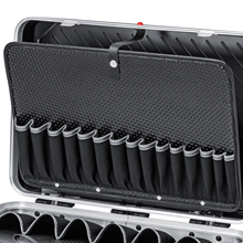 | Hinge mechanisms with lid-holding functionThe hinges safely guide the cover when closing and opening – and lock into place when they are open. | Removable tool boardsTwo removable tool boards made of Con-Pearl material with 27 tool pouches and clamp compartment offer plenty of space. | Stable, ergonomically shaped handleUp to 20 kg securely in your hand. The handle of the case is designed to withstand high loads and makes the case comfortable to carry. | Lockable flip locksThe flip locks keep the lid of the tool case locked and protect the tools from unauthorised access. |
