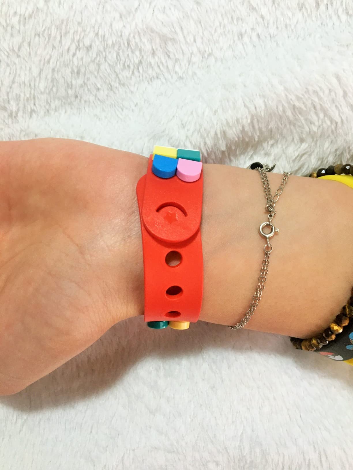 Le bracelet est de couleur rouge avec beaucoup de petites pices qui vous permettent de raliser le dcor de votre choix tout en laissant parler votre imagination.