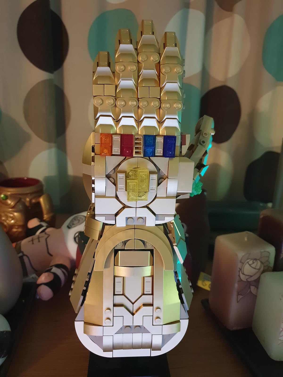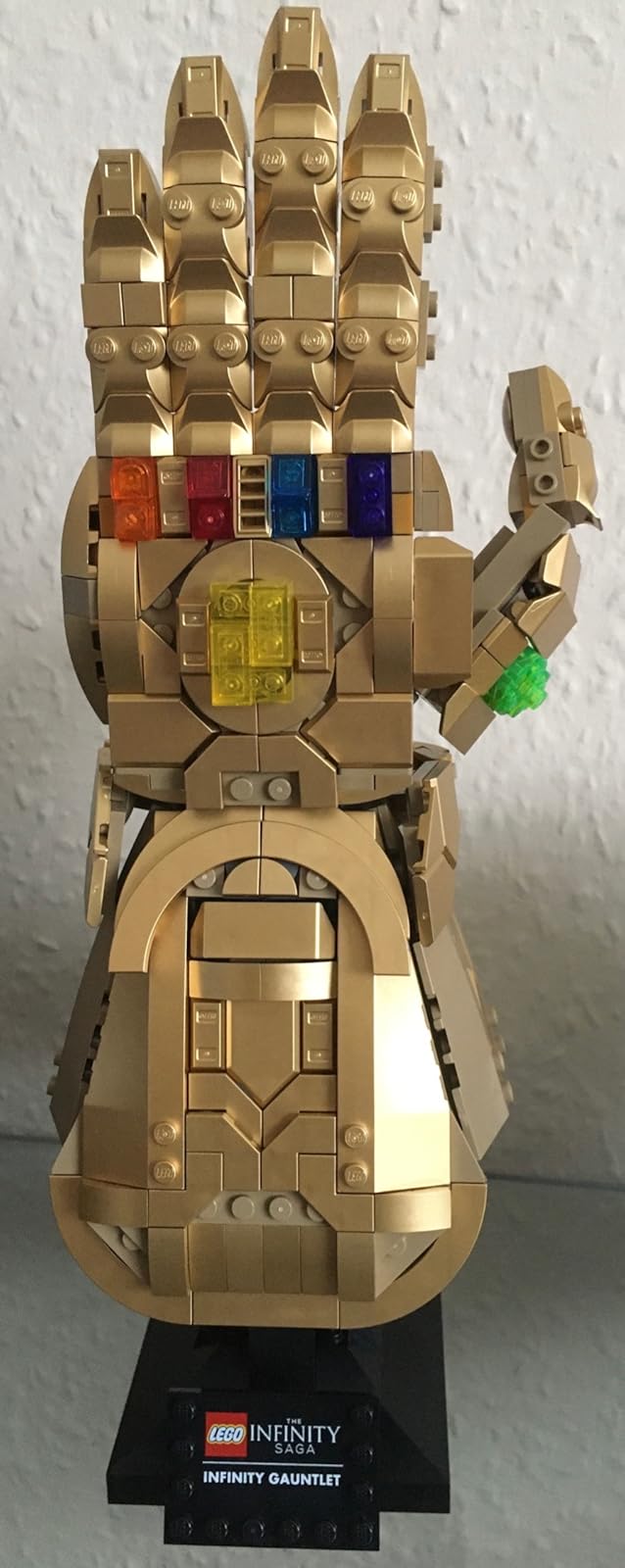 the amount of detail is incredible, all the pieces are made with amazing precision, as always Lego does the great job. Take a look at the photos, there’s not much more to say, its beautiful! all the fingers can be moves and shaped to create gestures, although the whole gauntlet is very delicate. Overall, its a great item for Avengers fans. It looks fantastic as a “trophy” in my studio.