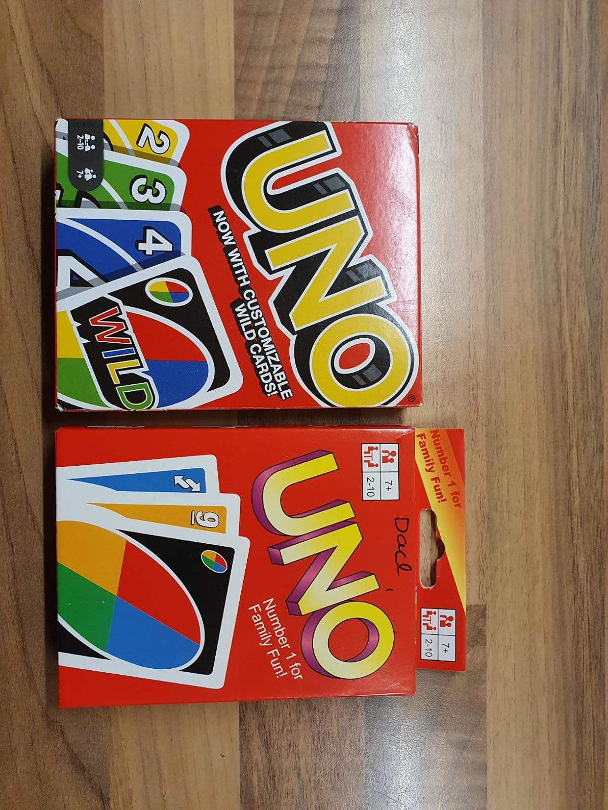 The cards were the original Mattel Uno cards and that was to be expected since it was sold and dispatched by Amazon itself. They are very good quality and it comes with customisable cards too so you can play with additional rules that makes it more entertaining and competitive.