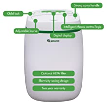 | Suitable for flats right up to small 3 bed house. Light enough to be moved around as required. | Low running costs at just 165 watts rated power consumption to save you money. | Cleans the air with the free HEPA filter that comes with the dehumidifier. Can be used as an air purifier only in Spring/Summer. | Meaco Control Logic and digital display to show you the room humidity and set your target realtive humidity. |