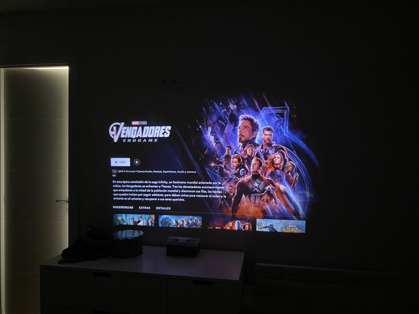 Este es nuestro primer proyector. Y de momento funciona de maravilla. Tanto la calidad de imagen como el sonido son muy buenos. Con el stick de Amazon podemos ver todas las plataformas que tenemos contratadas, Netfelix, Movistar, Disney +… lo ms complicado es encontrar una pared blanca donde poder proyectarlo….