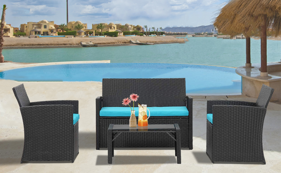 Rattan Garden Furniture 4-Seater Outdoor Furniture Sets All-Weather Black Wicker Sofa Patio conversation set with Blue Cushions Glass Table Check Offer Price Dimensions: 121.92 x 66.04 x 76.96 cm Brand: Homsido Model: FTUK411-black Colour: Black Colour: Black
