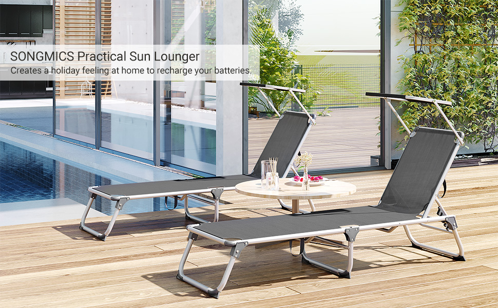 SONGMICS Sun Lounger, Sunbed, Reclining Sun Chair with Sunshade, Adjustable Backrest, Foldable, Lightweight, 55 x 193 x 31 cm, Load Capacity 150 kg, for Garden, Patio, Dark Grey GCB19WGV1