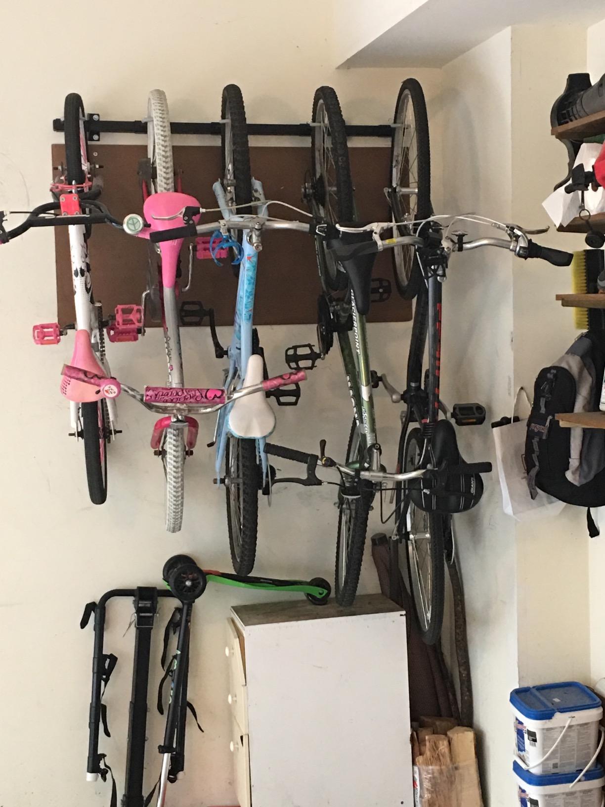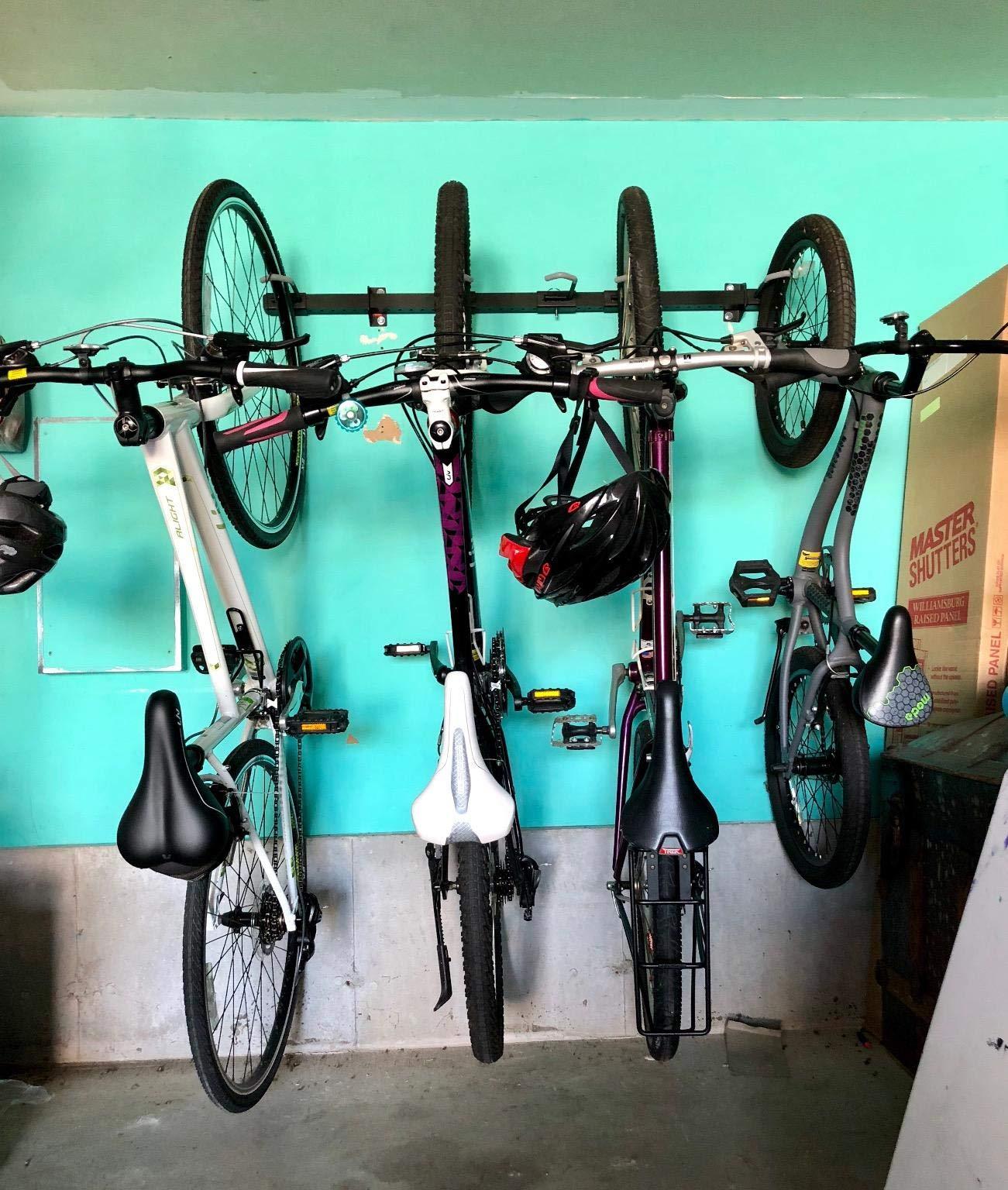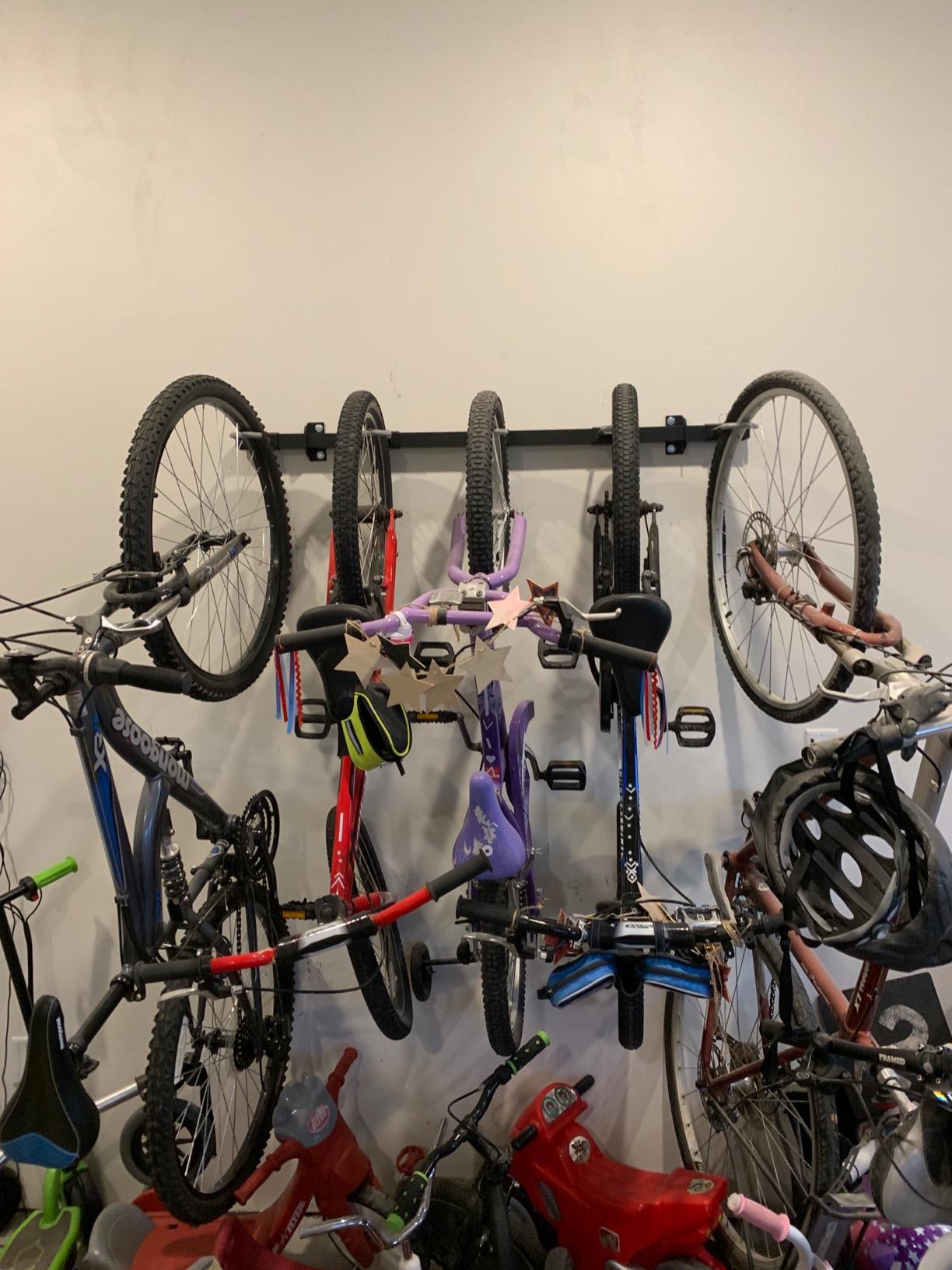 I was reorganizing the garage and decided to hang the bikes to reclaim the floor space. I was worried the kids would have a hard time getting their bikes on/off a wall rack but the haven’t had any problems. It only took 5 minutes to install and now I have a cleaner garage! It holds 4 bikes nicely, 5 will be tight.