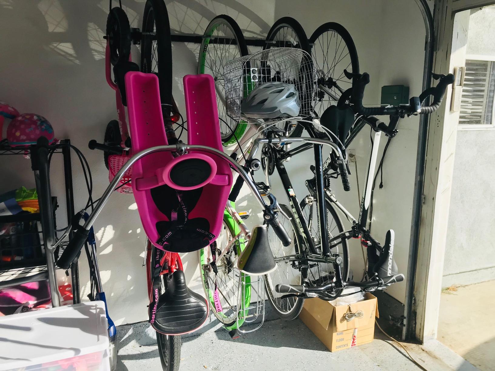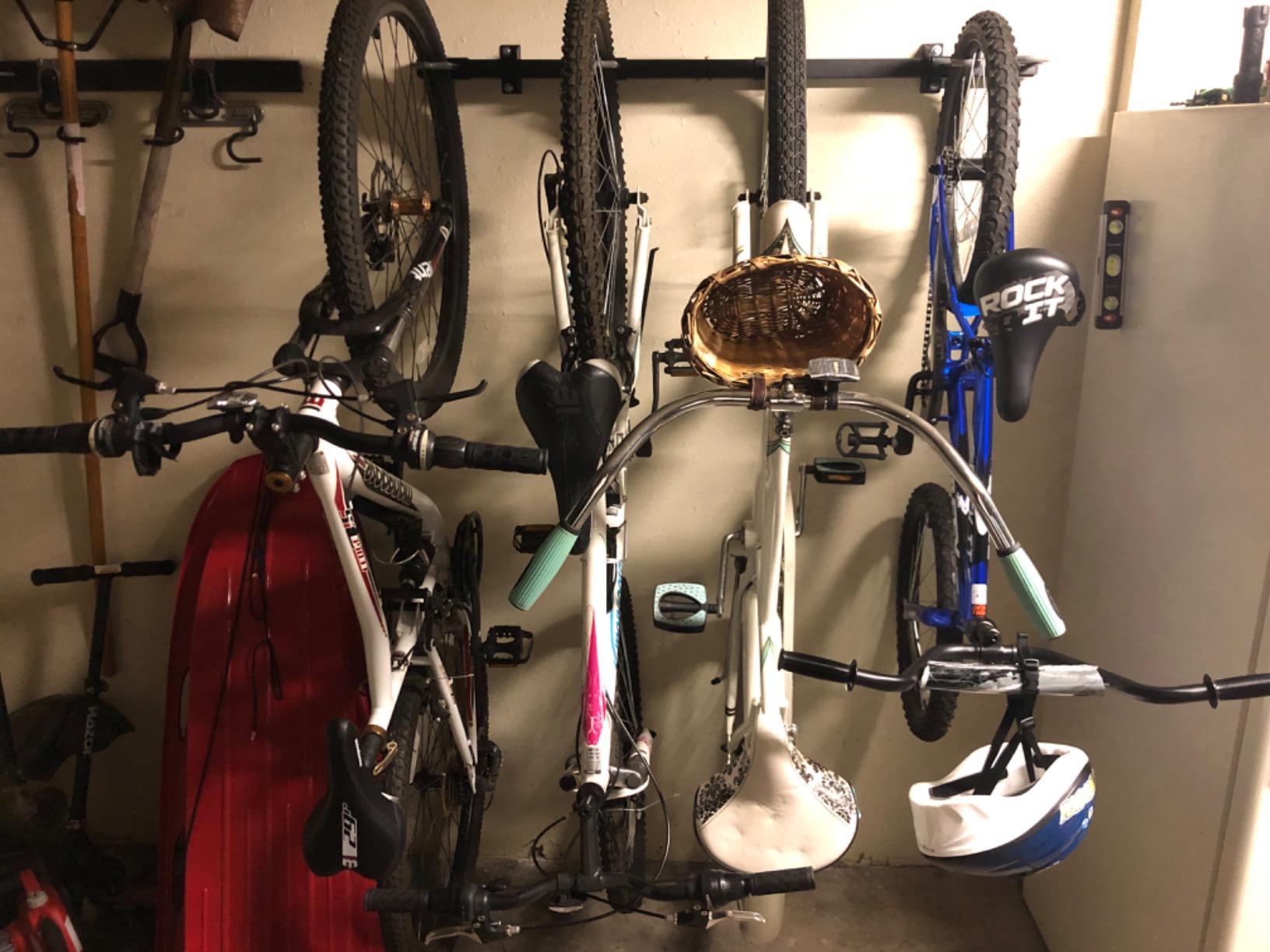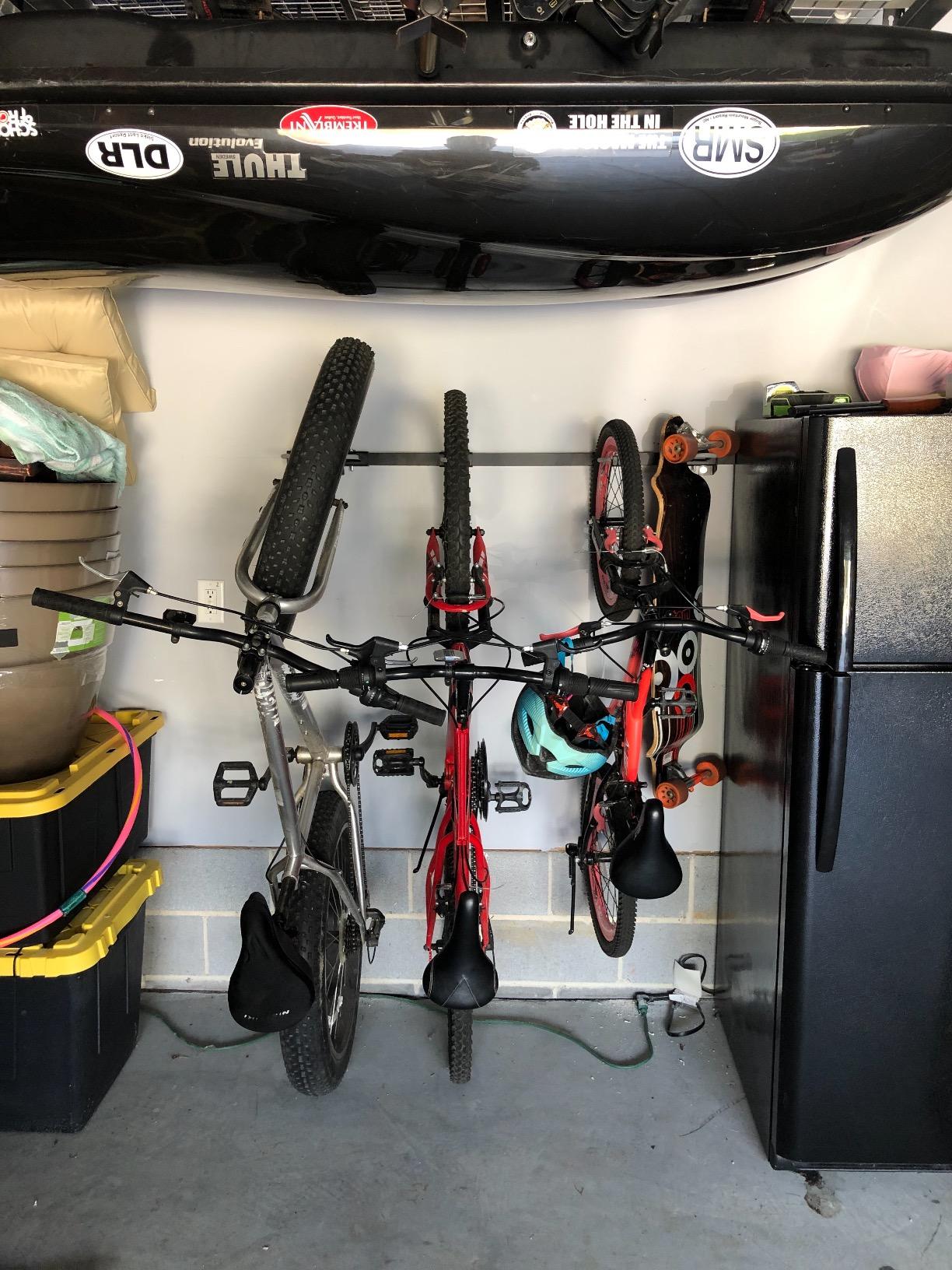I was reorganizing the garage and decided to hang the bikes to reclaim the floor space. I was worried the kids would have a hard time getting their bikes on/off a wall rack but the haven’t had any problems. It only took 5 minutes to install and now I have a cleaner garage! It holds 4 bikes nicely, 5 will be tight.